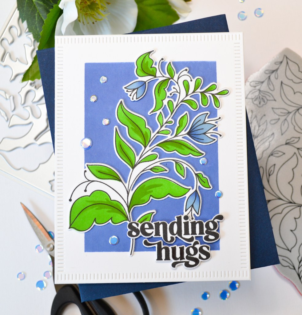 4.) Lastly, I stamped the sentiment, also from Pinkfresh Studio, with VersaFine Ink in Onyx Black. Versafine ink is great for providing crisp, clean lines and I use it often for sentiments. Just know that this is a pigment ink so it does need a little more dry time. After die cutting the Sending Hugs sentiment, I used thin foam squares to attach it to the bottom right of the card. I finished by adding some iridescent embellishments from Trinity Stamps and then attaching the entire panel to a side-fold card base.