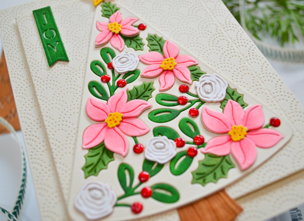 This lovely little tree is the Spellbinders July Small Die of the Month. For Christmas in July! Or August, it seems. The tree is adorned with these gorgeous poinsettia flowers, small rosettes, and some holly. This design reminds me of Nordic-inspired Christmas decorations, such a favorite of mine.