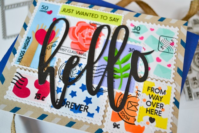 4.) Lastly, I stamped the oversized “Hello” with VersaFine Onyx Black ink and die cut it twice, gluing them together to give the scripty font added strength and stability. I attached this across my postage stamp collage and then affixed everything to a side-fold A2 card base.