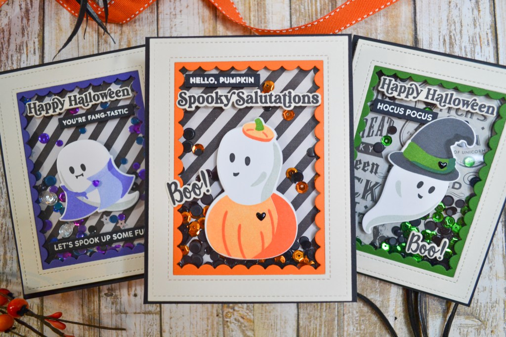 2.) I stamped the ghost images a few times before getting everything lined up correctly. Each ghost has a multi-step stamping process and I found that stamping the part 2 pieces before the part 1 pieces helped me align everything better. I also stamped sentiments and heat embossed at least one for each card before die cutting them. I attached everything to the front of the cards over the acetate windows so the shaker material moves around freely.
