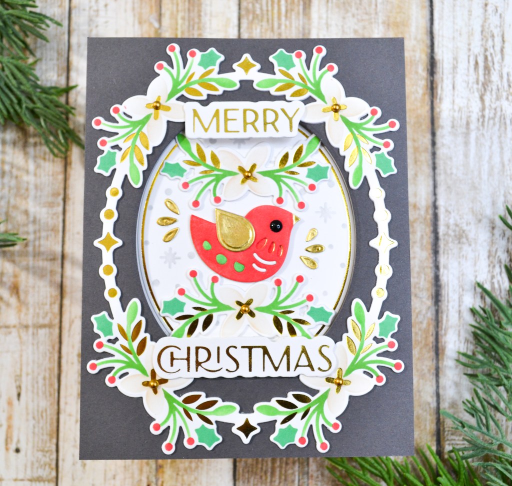 1.) My first step was to hot foil the frame, which takes place of the third layering stencil. I did this twice in gold on white cardstock. I also hot foiled the sentiment in the same gold, also on white cardstock. Then, I finished the frames by stenciling the first two stenciling layers but skipping the floral swags in the oval center. I used two shades of green, red and just a hint of Antique Linen for the flowers. One frame I die cut using both the inner and outer frame dies getting the thin frame you see above, saving the inner oval piece with the foiled border. I die cut another thin frame in plain white cardstock so that I could stack the frames for a little more weight and substance. From the second foiled and stenciled frame, I die cut just two of the floral swags with the coordinating dies and saved the rest for another project.