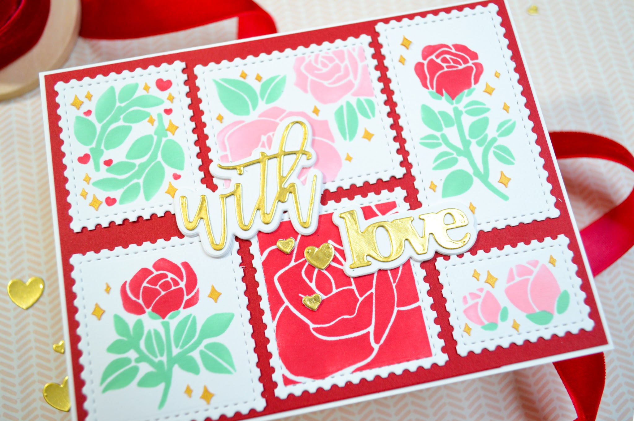 I couldn’t be happier to have won this Sneak Peek Club Kit #11 from Waffle Flower Crafts and the very talented Karen Downs! I know I’ve expressed how much I love Waffle Flower’s Postage Collage Bundle before and I was absolutely thrilled to open this kit and find a new, layered stencil to coordinate with the die, the Postage Collage Rose Stencil. I immediately went to work and created this Valentine’s Day card, pairing the stencil with the new Print and Script With Love Die. I used Distress Inks in a traditional Valentine’s color palette and, for the third stencil layer, I used gold stencil paste for a little sparkle. To coordinate with the bit of gold, I die cut the sentiment and a few hearts in matte gold cardstock.