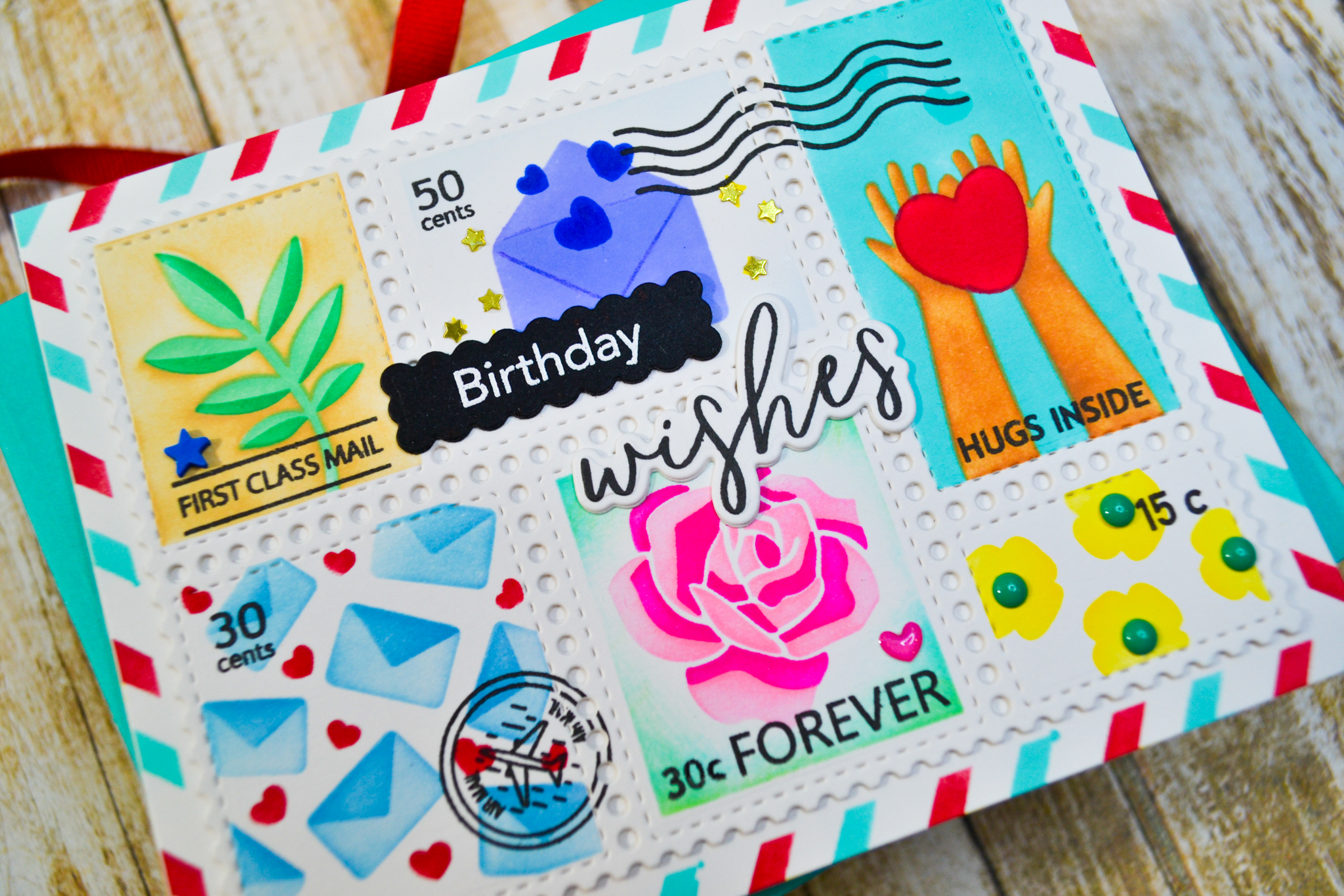 I went back to the Postage Collage Bundle for this card and I have so much fun every time I use the die and stencils included in the set. I didn’t really have a plan for this one, I just went in with some of my favorite ink colors and started stenciling. I added lots of little embellishment details and chose red and aqua for the air mail border. The red and aqua border makes me want to revisit the coordinating Christmas Stencil and make another Christmas card with this bundle. So, my little break from holiday crafting isn’t going to last very long! I’ve listed all the steps and supplies below. Thanks for stopping by my happy place!