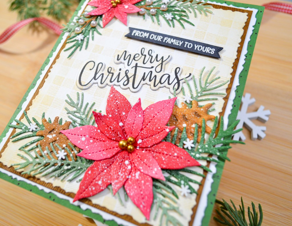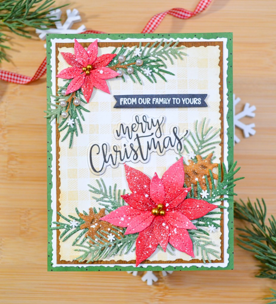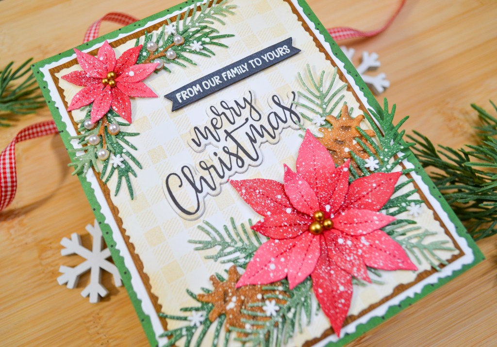 8.) Inlay the stacked “Merry Christmas” die cuts in the top, gingham layer that was die cut in step 4. Use liquid adhesive to attach the stacked die cuts and for all the elements for the swags. I attached the poinsettias first and then tucked the greenery and things around them. I trimmed things if needed to fit the scale and design.