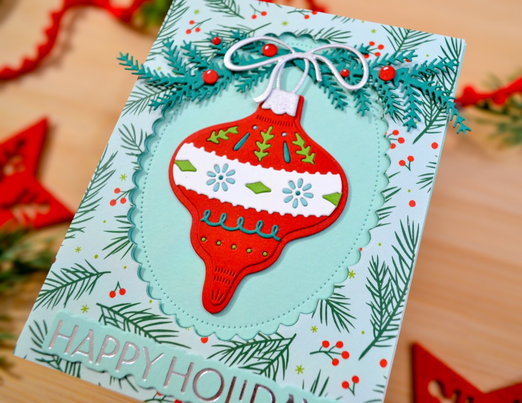 My card today features the most beautiful Layered Ornament Die from Waffle Flower Crafts. I inlaid the ornament with colored cardstock, pulling colors from the patterned paper I used, a favorite of mine from Concord and 9th. I nestled the ornament in a scalloped oval from Lawn Fawn and topped it with greenery from Waffle Flower’s Layered Winter Bird. A silver ornament topper, few holly berries and a foiled sentiment complete this merry card design.