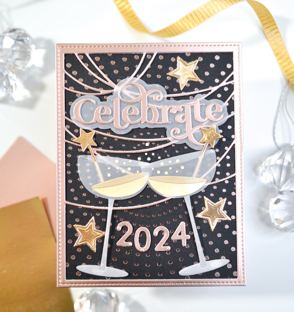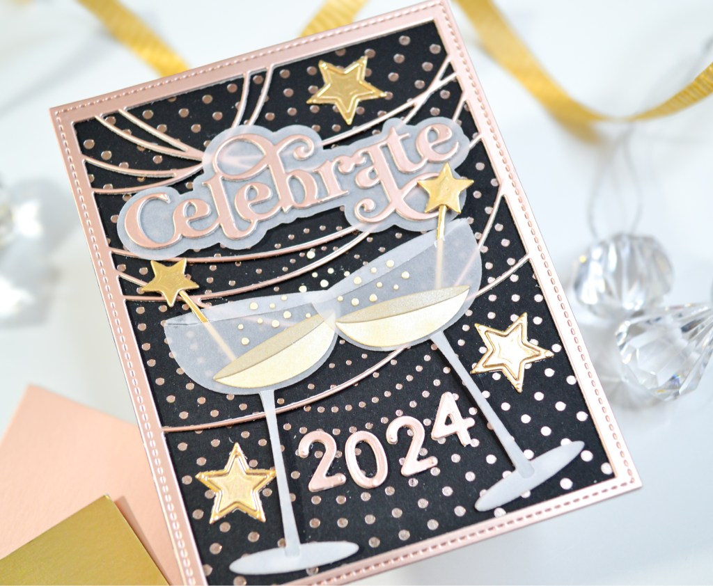 In the meantime, I’m sharing this fun card made with the December Large Die of the Month from Spellbinders. I love the champagne and wine glass dies included in this set, and the dies for adding the liquid to your glasses are what, I think, make this month’s club really special. I used vellum for the glasses and had to get pretty creative with my adhesive because of its transparency. I combined this month’s dies with the Hypnotic Background Glimmer Hot Foil Plate from Spellbinders and the Mama Elephant Party Scene Cover, all in rose gold. Also in rose gold is the Celebrate Wafer Die from Simon Says Stamp, in a font that I’m kinda obsessed with right now. It reminds me of decorative brush or hand lettering. I want every sentiment in this font. Adding a few gold accents and some shimmery metallic papers makes for a sparkling, festive New Year’s card!