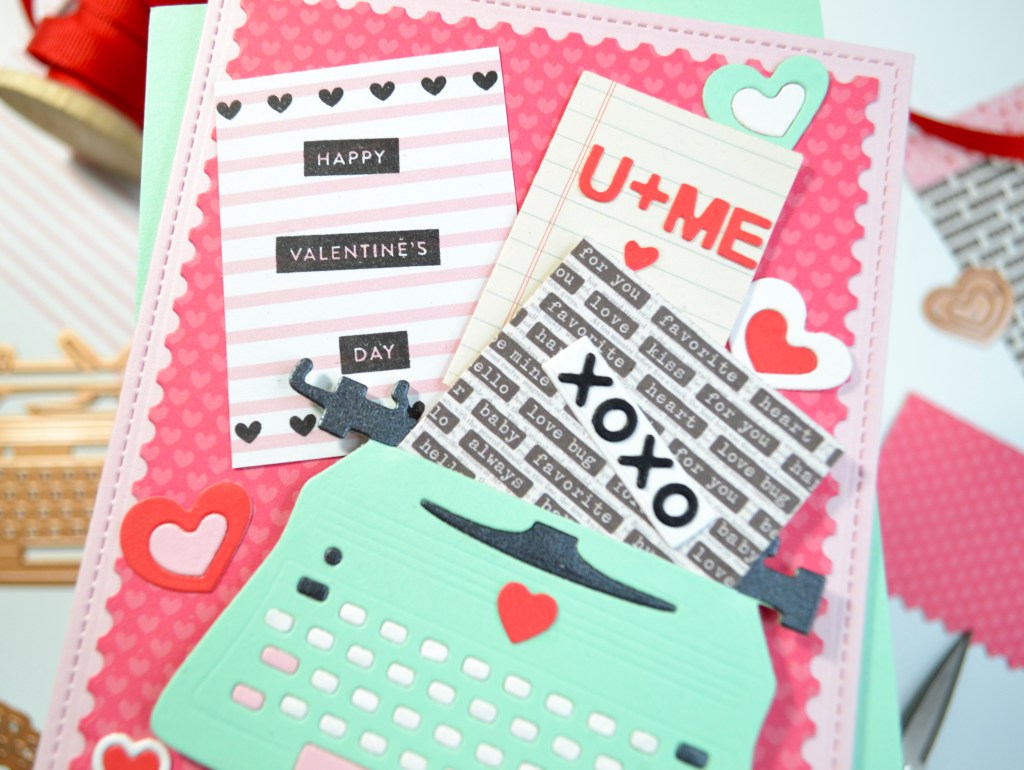 2.) Die cut the typewriter 4 times in the colored cardstock of your choice. I chose, mint green, light pink, white and a metallic gray. Assemble the typewriter, securing the components with glue. Die cut a small red heart and attach to the typewriter with glue.