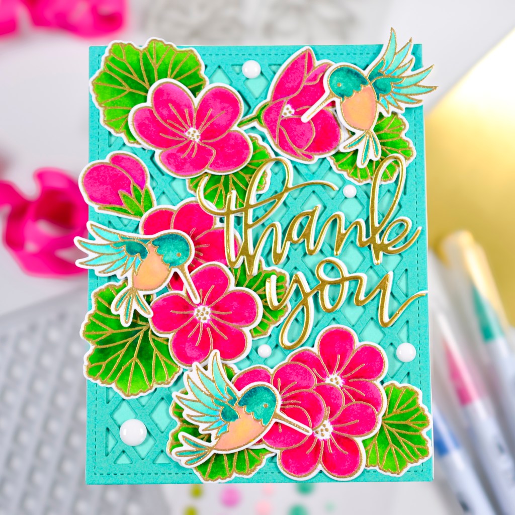 I ended up heat embossing the images in gold, coloring them with watercolor markers, and making the flowers pink and the lattice background a pretty teal color. Pretty much the opposite of what I had planned. But I really love how this card turned out, particularly those sweet hummingbirds. The wings and beaks look amazing embossed in gold. I finished my design with a scripty, matte gold Thank You, also from Pretty Pink Posh, and some white enamel dots.