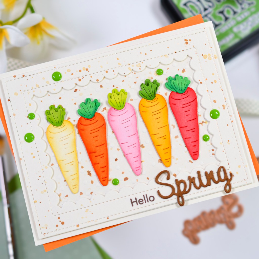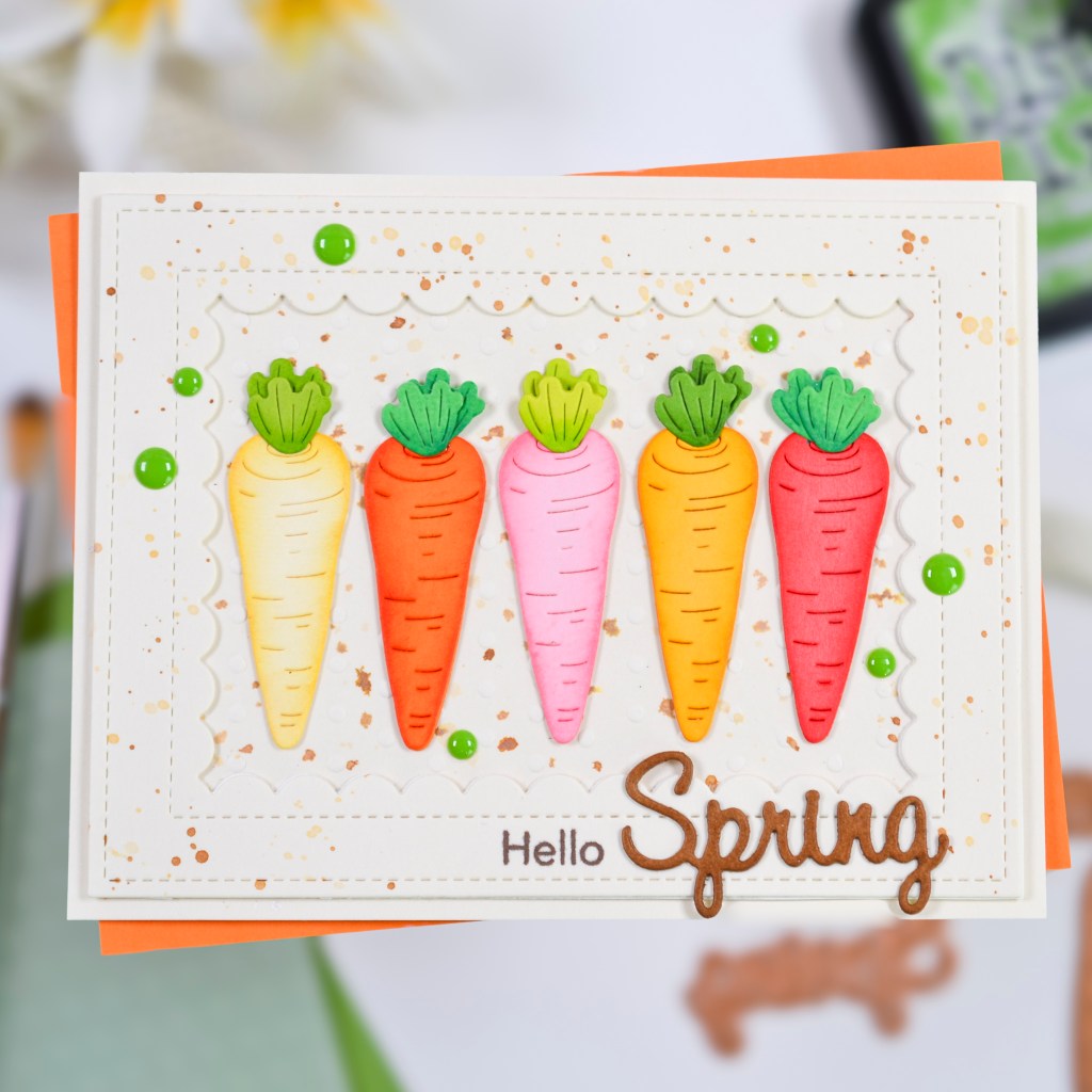 The Spellbinders February 2024 Large Die of the Month set is filled with 18 Easter and spring-themed dies, including this adorable little carrot. For this project, I chose to just die cut this little guy five times and create a rainbow of carrot colors for the quintessential spring card. I love the simplicity of this card design and how it showcases that an ordinary thing, like a garden carrot, can be beautiful. I used colored cardstock for these little beauties and added some shading with Distress Inks. The speckled, splattered background was made with more Distress Inks and Lawn Fawn’s Vanilla Malt cardstock. A sentiment and some enamel dots for embellishment are the only additions to this quick and easy spring card. All the details are listed below. Thanks for stopping by!