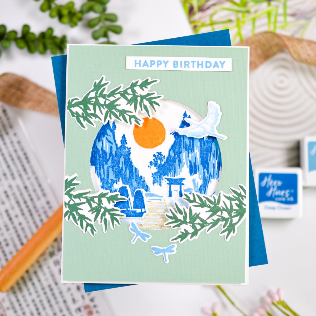 For my first project, I used the cover plate, which creates a subtle debossed pattern, and die cut a circle from the center, creating a window for the breathtaking mountain scene I made by using the stamps and some of the inks in the kit. I added dimension by popping up the window panel with foam tape and adding a few of the bamboo leaves to the outside of the scene to peek through. The crane and dragonflies round out my card design, and a simple stamped sentiment is the finishing touch.