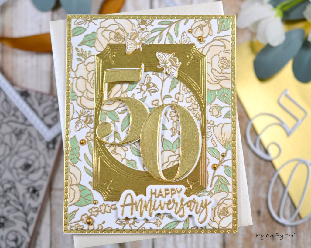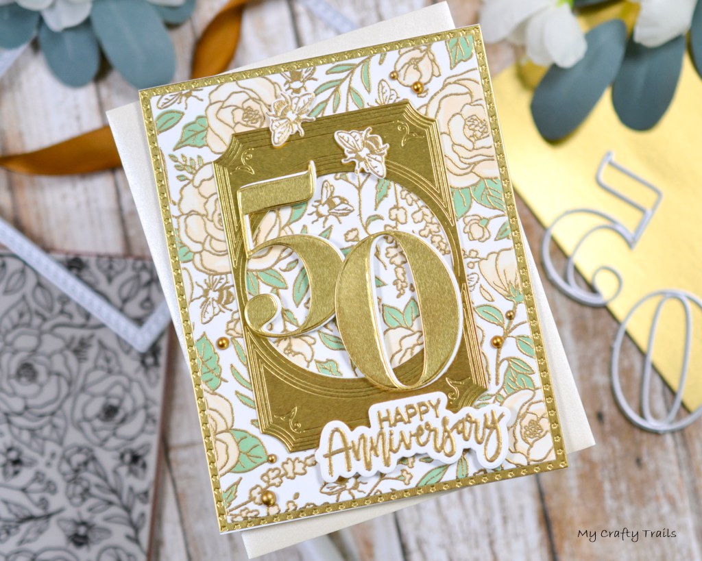Next, I layered the trimmed panel on a matte gold frame die cut using the Honey Bee Stamp’s Lovely Layouts: Party Frames. I used another frame from this set for the center of my card, also die cut from matte gold cardstock, but modified it a bit by die cutting the center area with a nesting circle die. This provided the perfect place for the focal point of my card design, the Number Five and Number Zero Fancy Dies from Hero Arts. I’ve been wanting some of these number dies ever since they were released last year, and I’ve decided I need them all now. I die cut these from matte gold cardstock too and gave them a bit of a highlight by offsetting a white die cut behind them. I overlapped them a bit and attached them with foam squares.