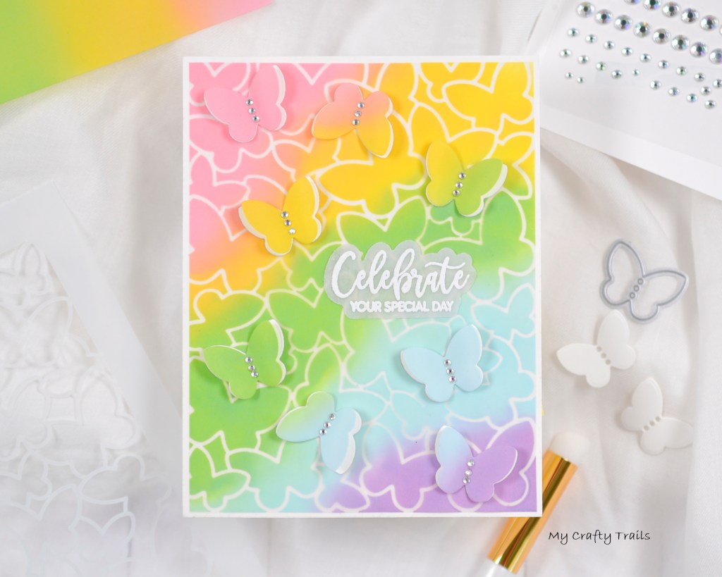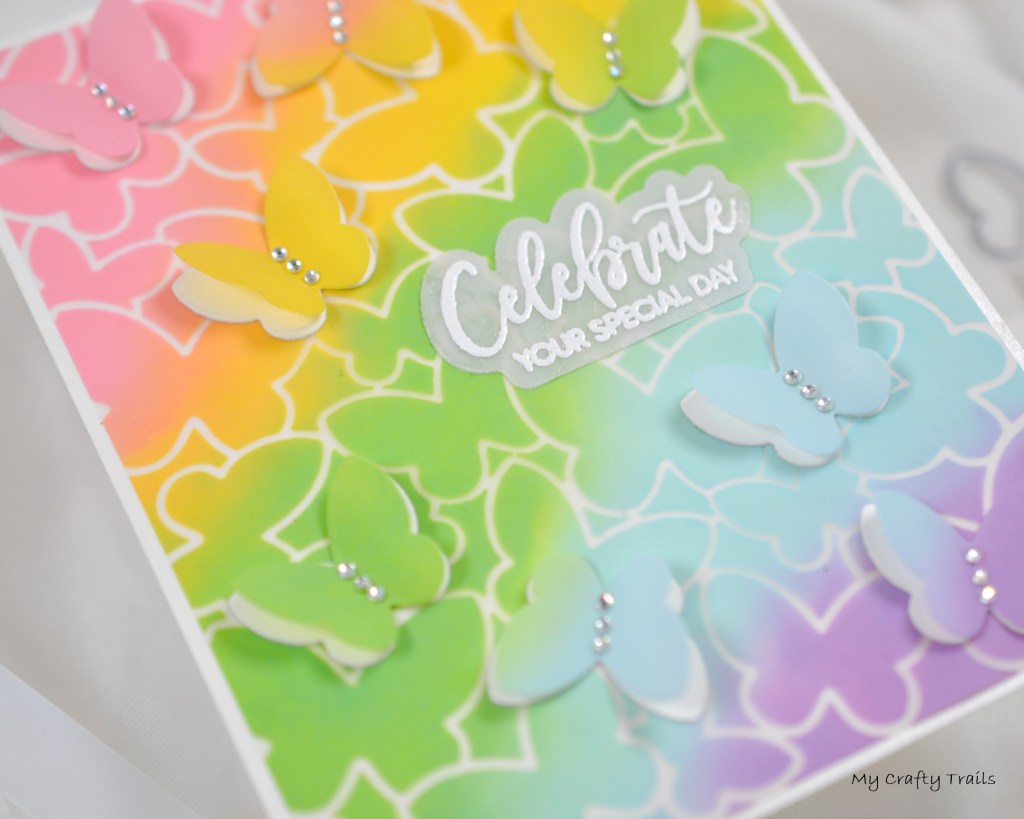 Next, I created another rainbow blend of Distress Oxides on vellum but without the stencil. I used this blend to die cut multiple butterflies using the small Dotted Butterflies Die. I also die cut multiple butterflies from white cardstock to layer with the vellum ones. I used 1/8″ double-sided tape down the center of the white cardstock butterflies and then attached the vellum butterflies, bending the wings up a bit to give them some dimension. For a little sparkle, I added tiny gems along the fold, securing them with liquid adhesive.