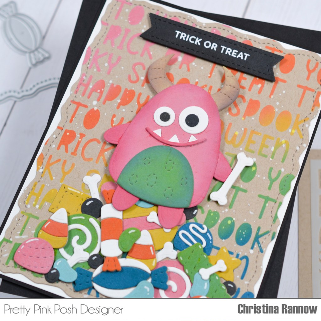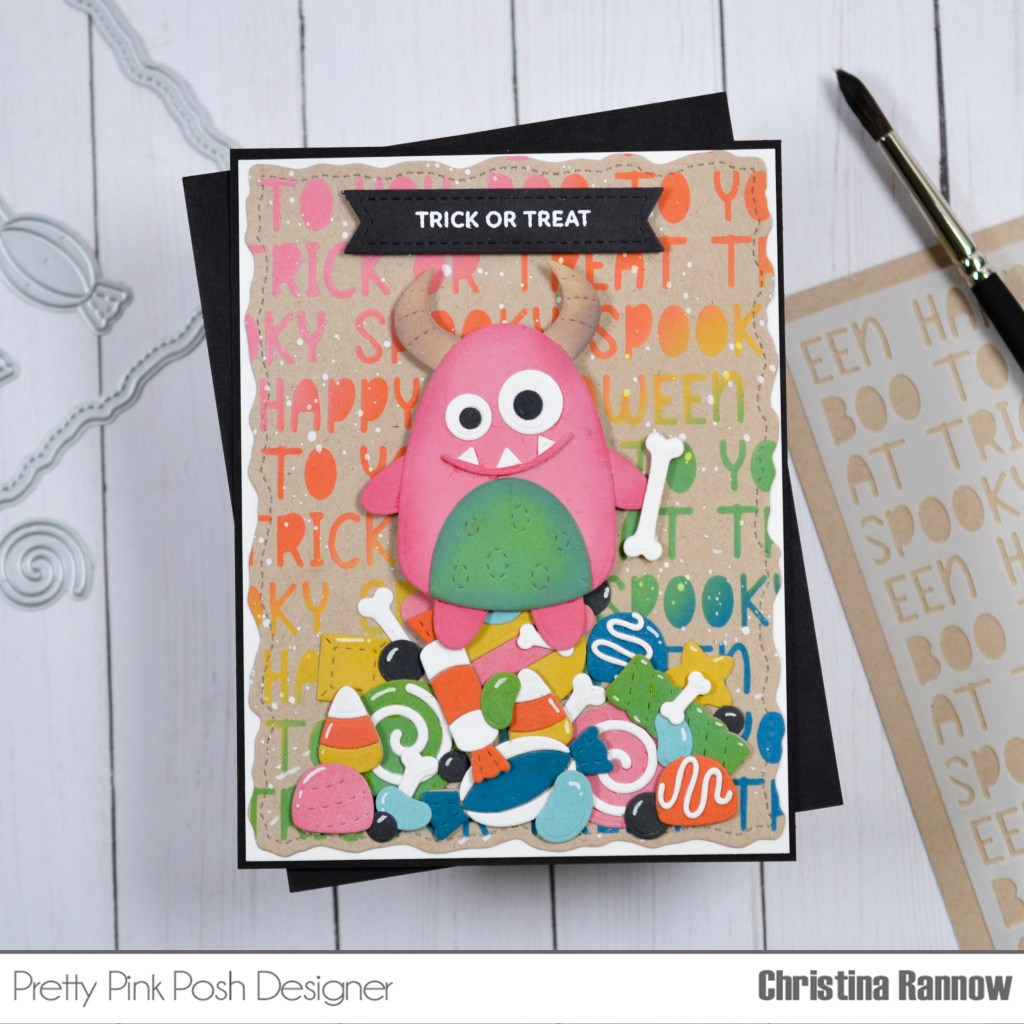 The Pretty Pink Posh Halloween release is now available, and one of my favorite things is the Build a Monster Dies set. The monster possibilities are endless with this set; even shaker cards are possible, and every monster you build will be adorable. I used the new Halloween Words Stencil for my background and propped up my monster on top of his stash of Candy Treats. Follow along to see how I make this fun Halloween Monster card.