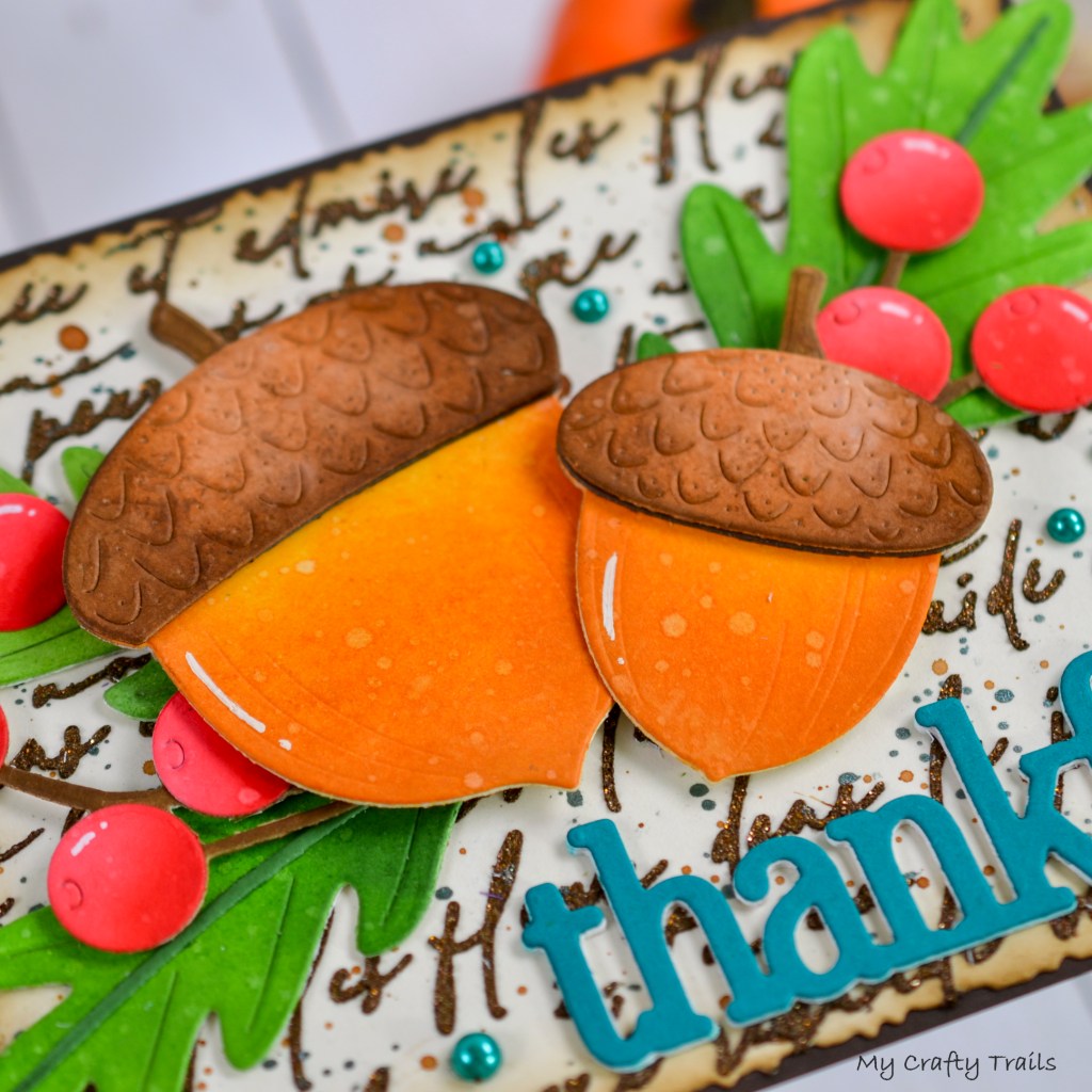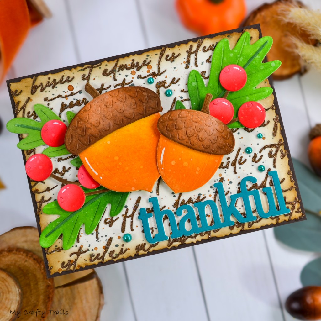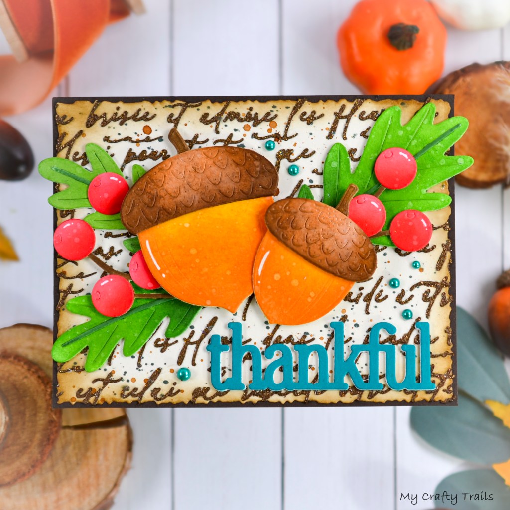Hi friends! Today I’m sharing another inspiration project showcasing some of the most beautiful autumn-themed products from the latest Papertrey Ink release. I layered the new Into the Blooms: Acorns Die on a distressed and glittery stenciled background and added a bold sentiment from the This is Big Sentiments: Thankful Stamp set. This card is bursting with the colors of autumn, and it’s the perfect way to express gratitude this season. Keep reading to follow along with the steps to create this Papertrey Ink inspiration project.