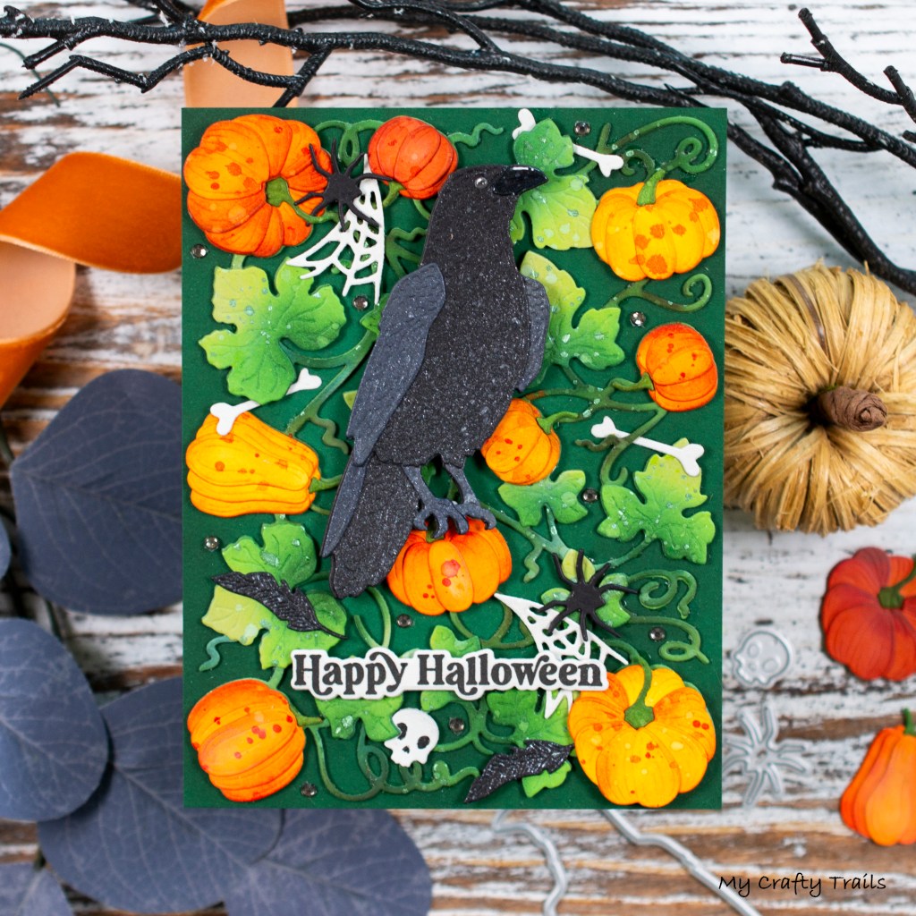 I die cut the remaining elements from Black Licorice and Fog Gray cardstocks, adding glitter spray to the feathers and spider webs before tucking all the elements into the pumpkin patch base. For the final details, I added some gemstones and a greeting from the SSS Friendly Ghosts Stamp Set, that I stamped in black on Fog Gray Cardstock and die cut with the coordinating die.