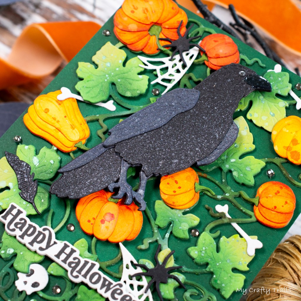 To create the crow, I die cut the layers from Black Licorice and Slate Gray cardstocks. I added a little Black Soot Distress Ink to the gray layers and then spritzed everything with a glitter spray before assembling them. After assembling the layers, I added white gel pen highlights to the eye and the beak before adding Glossy Accents. After letting the glossy accents dry, I attached the crow to the pumpkin patch with foam squares.