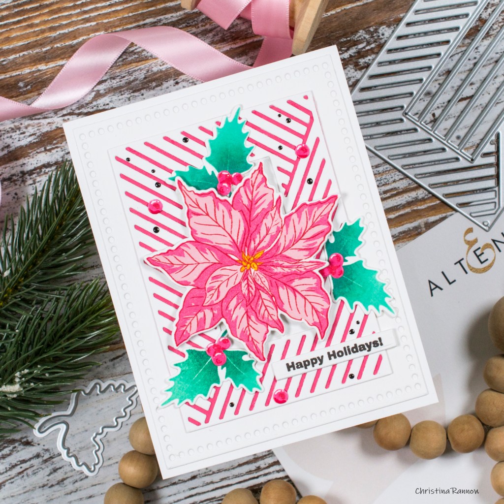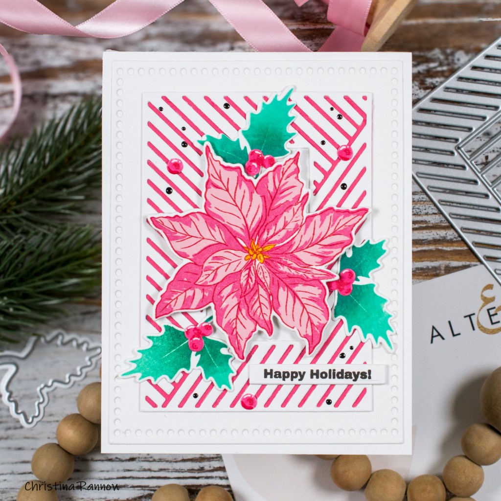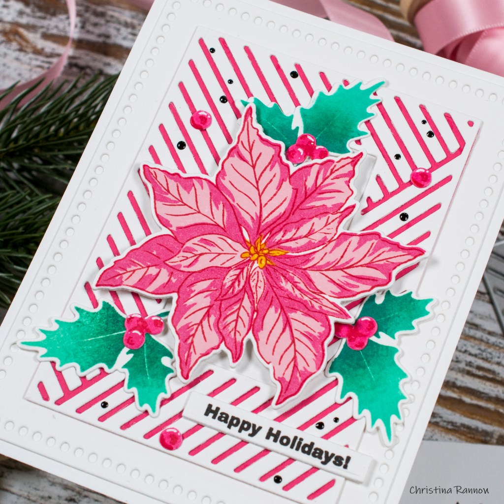 Next, I stamped the images for my card design. I used two shades of pink and red ink for the poinsettia leaves and a mustard yellow color for the center. For the holly leaves, I blended two shades of green right on the stamp before bringing the stamp to my paper and then die cut them and the poinsettia with the coordinating dies. I used the berries from the Winter Cardinal set, die cutting them from cardstock inked with pink ink before stamping the shading details with red ink.
