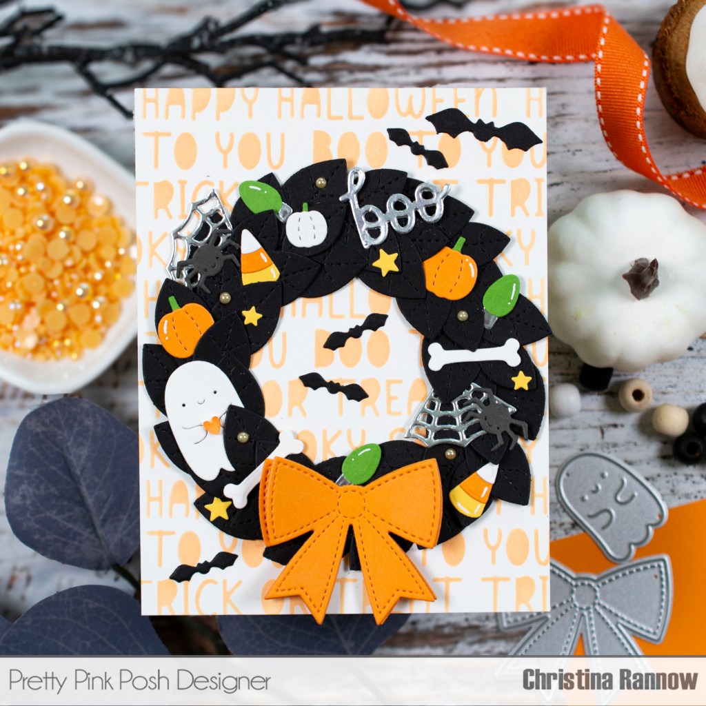 Happy Halloween, friends! This fun project features a variety of spooktacular Pretty Pink Posh products, along with a few products that I reimagined to be spooktacular. I used the new Holiday Wreath Builder and Christmas Lights Garland Dies in a totally unexpected way and created this Halloween Wreath that’s all gussied up for the spookiest night of the year. Other than the stenciled background, this project is all die cutting. So grab your favorite colored cardstock and let’s get started!