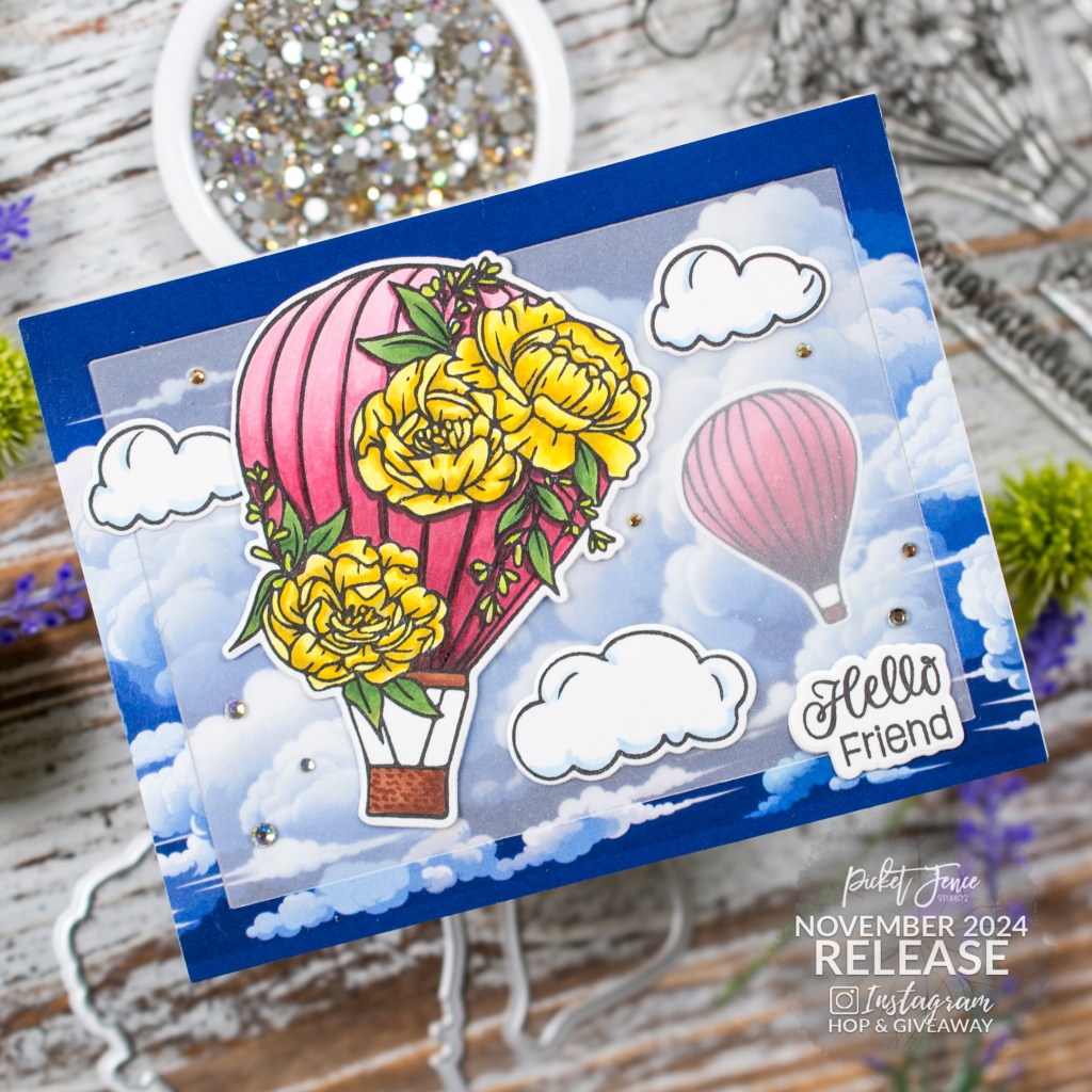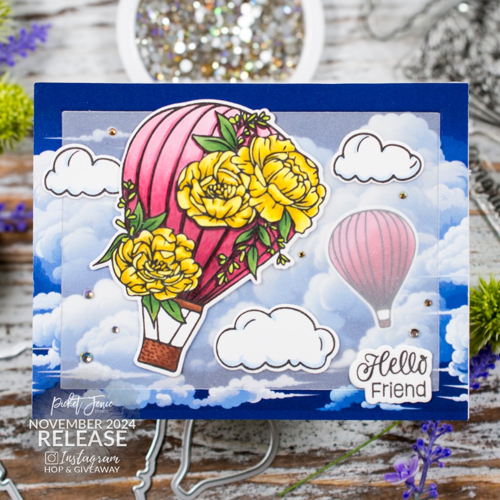 Hi friends! I’m so excited to be joining Picket Fence Studios for their November 2024 release, including their Instagram Hop & Giveaway. The Up, Up, and Away release is full of the dreamiest new products, including this beautiful new stamp and die set, You’re on Your Way Up, illustrated by Kelly Taylor. I used Copic markers to color the images before die cutting them and then chose one of the stunning Blue Skies Ahead: Fabulously Glossy A2 Card Fronts as my background. For an even dreamier feel, I layered a piece of vellum over just the center area of the background after die cutting a simple rectangle frame from the panel. The finishing details for my card design were to add a sentiment from the set and a few sparkly embellishments from the Starry Skies Sequin Mix.