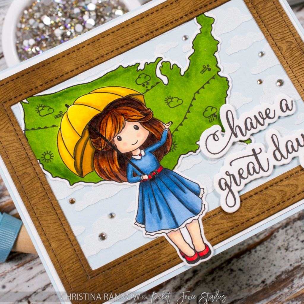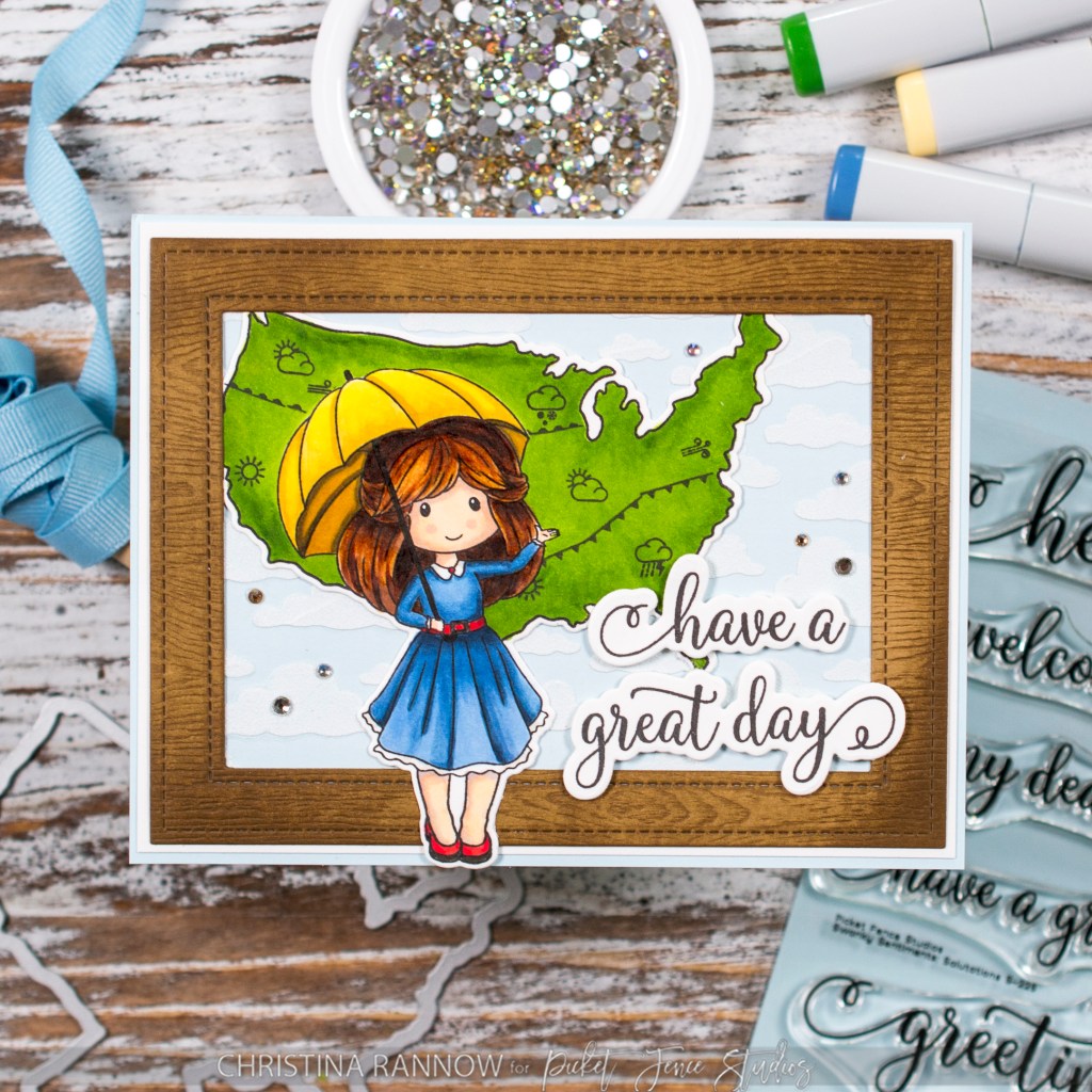 Today I’m sharing my last project featuring products from the latest Up, Up, and Away Release from Picket Fence Studios. I used the sweetest weather girl image from the Freckle Friends: Windy Willow Stamp Set and colored her with Copic markers. I stamped little weather icons on the map and then die cut the image with the coordinating die. To create the background, I stenciled the On a Cloudy Day on light blue cardstock with Winter Snowfall Paper Glaze and framed it up with an inked woodgrain frame. I finished with a sentiment from Swanky Sentiments: Salutations and a few gems from the Starry Sky Mix.