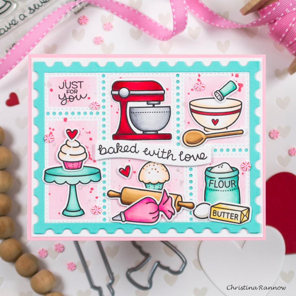 With most of the elements completed, I started to assemble my card. First, I mounted the Postage Collage background on two cardstock panels, one white and one pink, and added a Skinny Postage Frame from Papertrey Ink die cut from aqua cardstock. Next I attached all of my die cut elements with either liquid adhesive or thin foam squares. And finally, I added a couple of sentiments. I stamped “Baked With Love” on a banner die and attached it with foam squares and then stamped a small “Just For You” directly on the background of the smallest stamp. I pulled this from Lawn Fawn’s Tiny Tag Sayings.