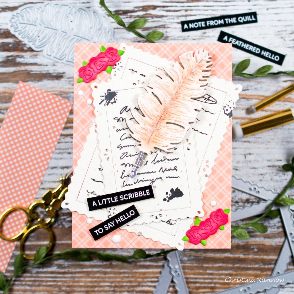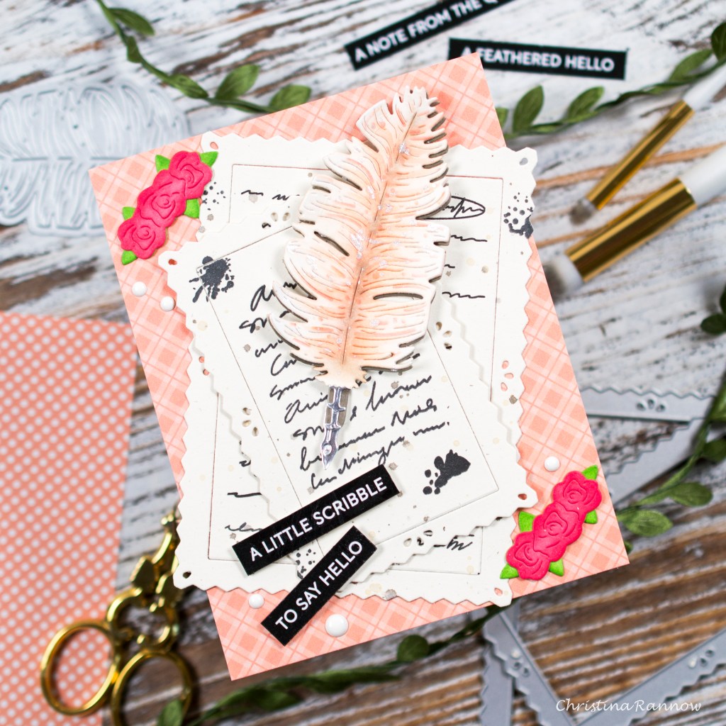 Next, I die cut the elements for the Feather Pen and stenciled it with the coordinating stencil using Dried Marigold, Worn Lipstick, and Pumice Stone Distress Inks. For a little sparkle, I spattered it with Picket Fence Studios Watercolor Splatter: Liquid White Snowflake. For some depth and dimension, I stacked the feather with a couple of more die cuts, the bottom one inked with Pumice Stone. And for the nib of the feather pen, I used matte silver cardstock and then attached the assembled pen to the pinking rectangles.