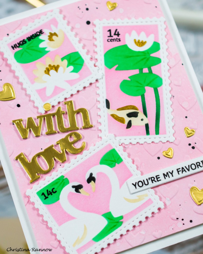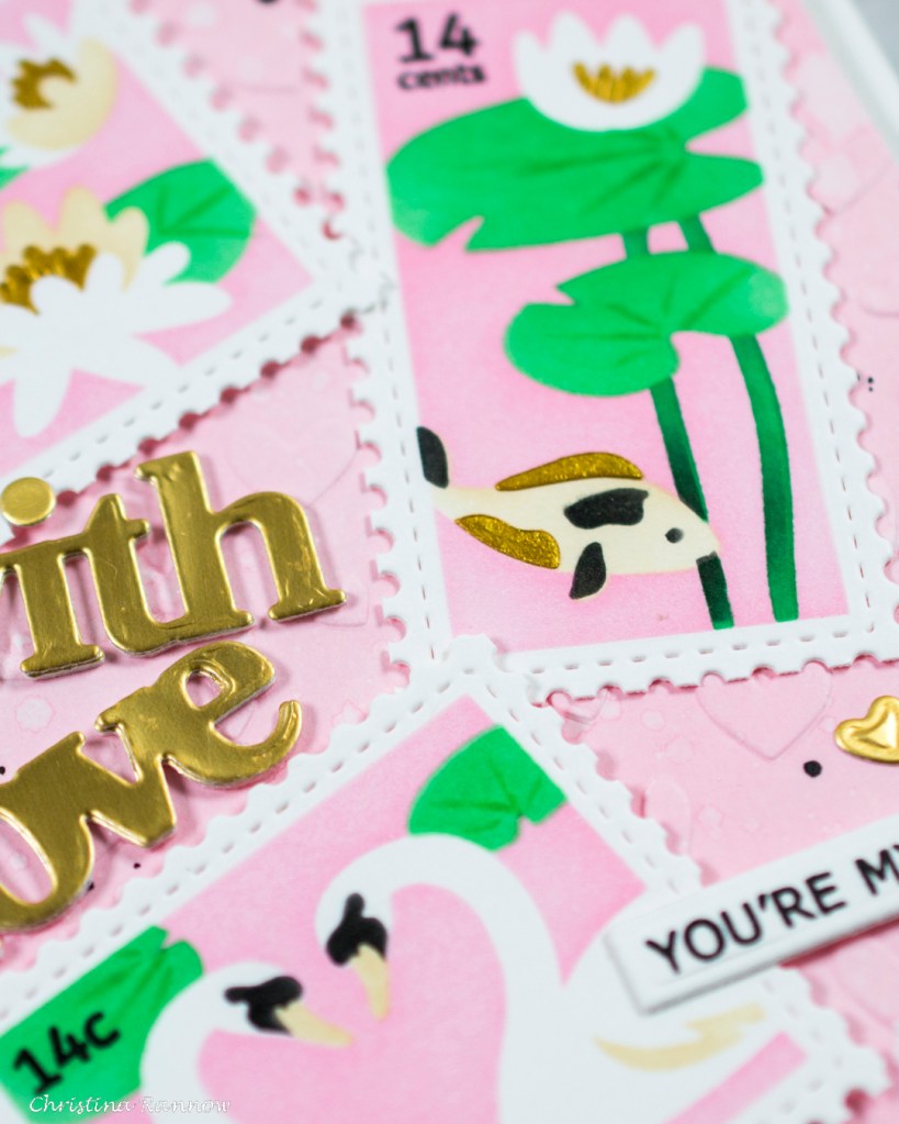 I started my project by die cutting the Postage Collage die from white cardstock and then stenciling it with the layered pond stencil using the ink colors listed above. I chose to use gold stencil paste for the flower centers and for some of the details on the koi fish. These elements are on two separate stencil layers, so I let one element dry before moving on to the other. I snipped the postage collage apart into individual stamps and added a small sentiment to one and denominations to the other two, and to finish them up, I added a simple veining to the lily pads with a Copic marker.