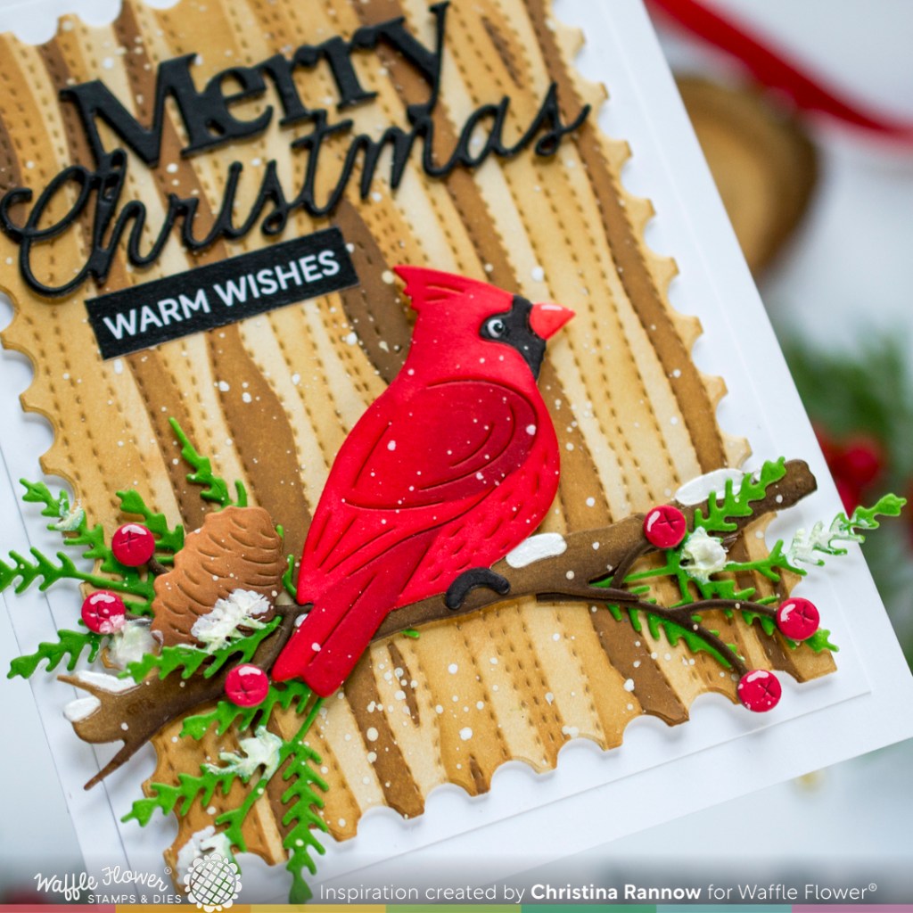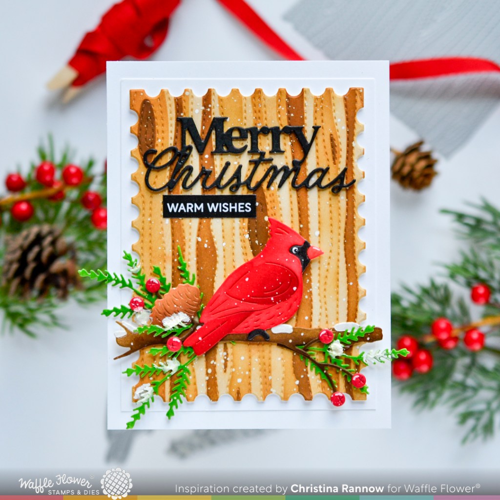 Hi friends! Today I’m sharing my last inspiration project featuring products from Waffle Flower’s Magical Christmas release! In my last Waffle Flower post, I showcased two of the new die-n-stencil sets, and for this card I used another new die-n-stencil set, the Cardinal Duo. I chose to use just one of the mirrored cardinals for this design and paired him with the Woodgrain Die-n-Stencil, giving him a warm and cozy backdrop. Below you’ll find a supply list and then a description of how I used those supplies to create this inspiration project for Waffle Flower’s Magical Christmas release!