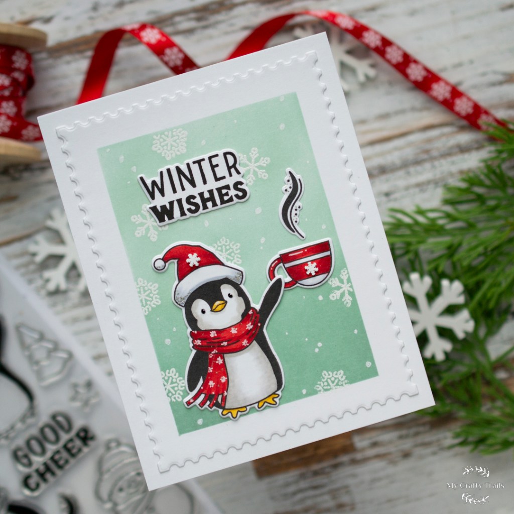 Today I’m sharing another STAMPtember exclusive! This limited edition Memory Box collaboration with Simon Says Stamp is so adorable; I know it won’t last long! I used this set to create a frosty, wintery scene featuring one of the pudgy little penguins and gave him a snowy backdrop using the snowflakes from the set to do an embossed-resist technique. Check out my supply list below, and then we’ll get started!
