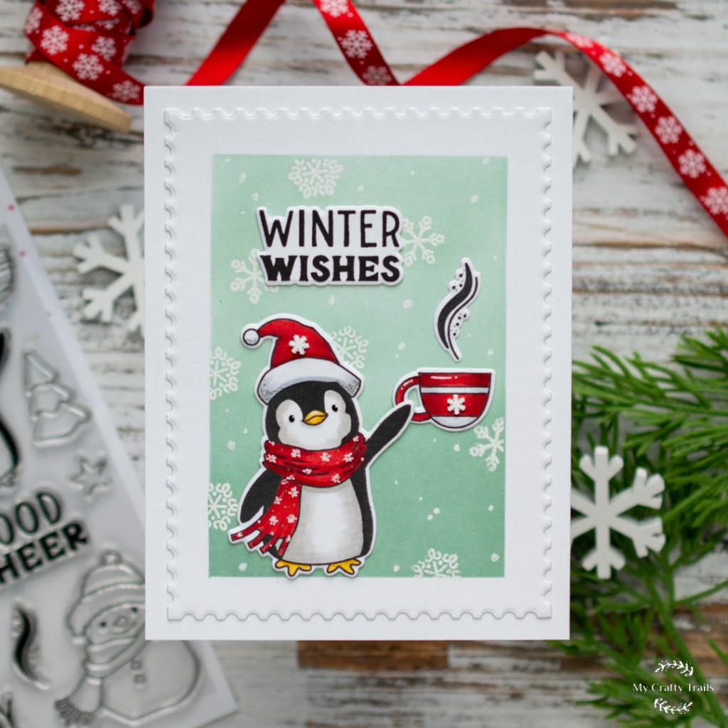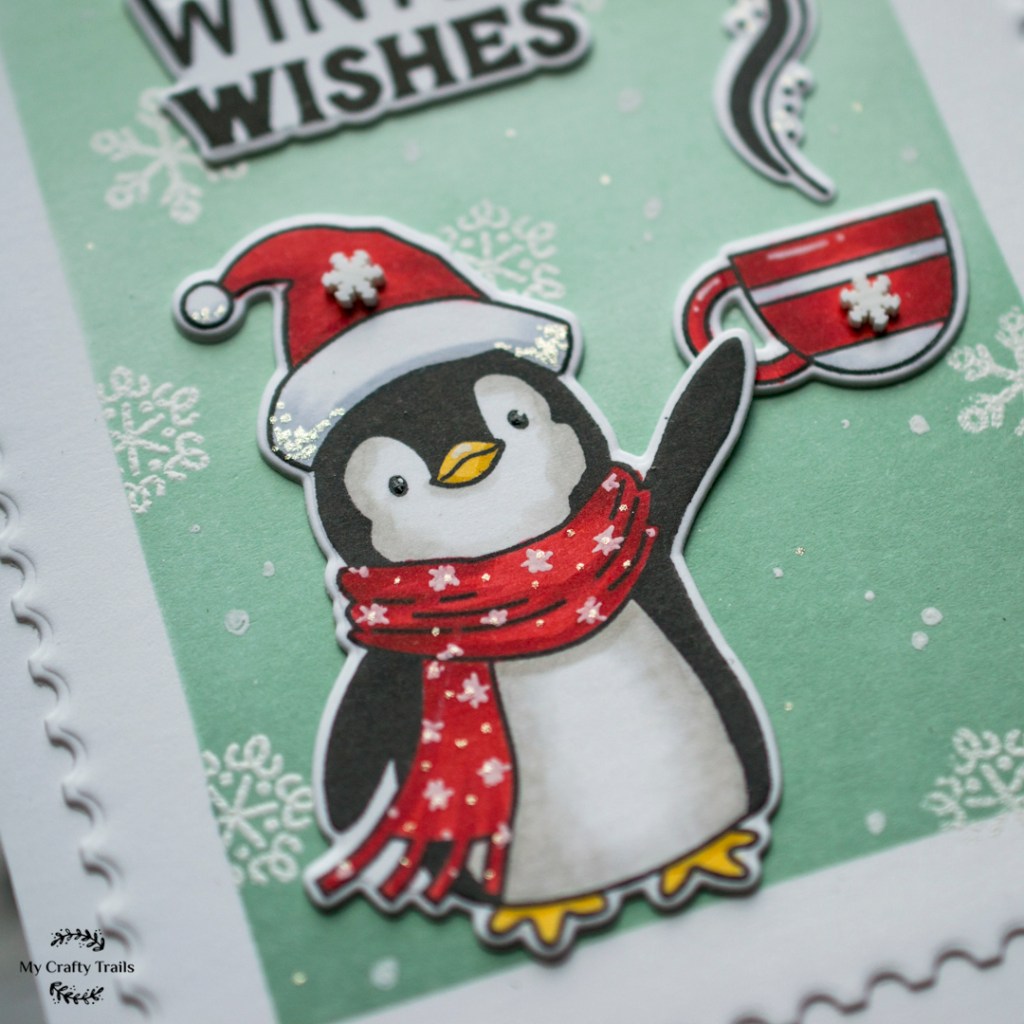 Next I stamped the images with a Copic-friendly black ink on white cardstock and then colored them with alcohol ink markers before die-cutting them with the coordinating dies. Then, using a white gel pen, I added a snowflake print to the penguin’s scarf and highlights to the mug. I also used a black glaze gel pen for his eyes and a stardust glitter pen for adding a bit of sparkle to the hat. Before moving on, I stamped the sentiment with VersaFine Onyx Black ink, for crisp, clear lines, and then die-cut it as well.