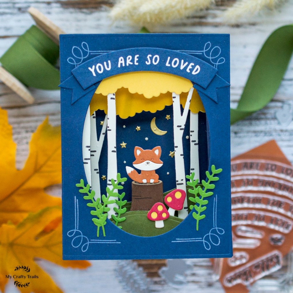 Today’s creative adventure was creating this 3D box card featuring the newer Accordion collection from Concord & 9th. These dimensional cards fold flat so they will slip neatly inside an envelope for easy mailing. I’ve made many box cards in the past, but the Accordion Card Base Dies make it so much easier! Plus, all the add-on bundle sets, like the Woodland set I used here, include a variety of scene-building options and are, of course, sized perfectly to fit your scene. Let’s take a closer look!
