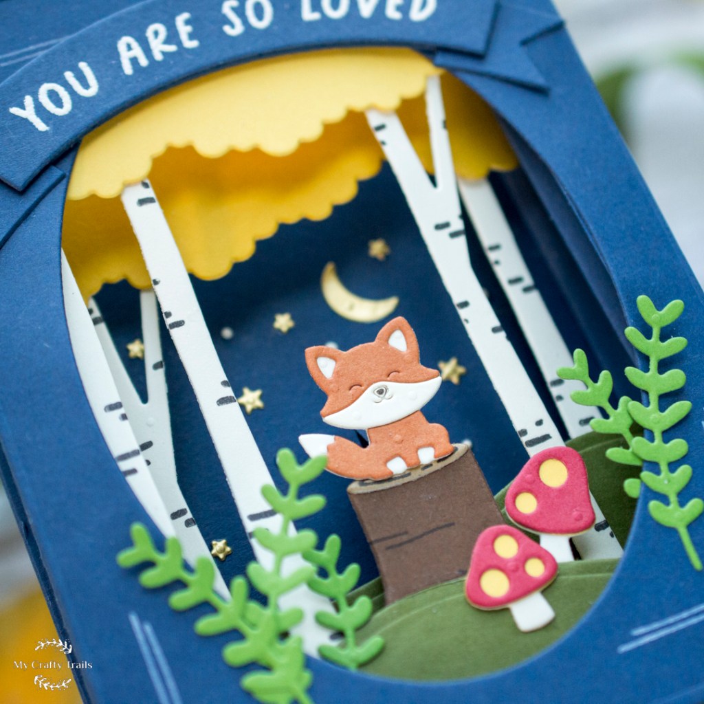 Next, this time using a liquid adhesive, I added the treetop layers and the grassy hills, ensuring I allowed enough space for the other elements in the scene, like the fox, the moon, and the stars. At first I had them too close together, and the fox and the tree stump barely fit in the scene. So, I adjusted their positions and then continued to build my scene with the remaining diecuts.