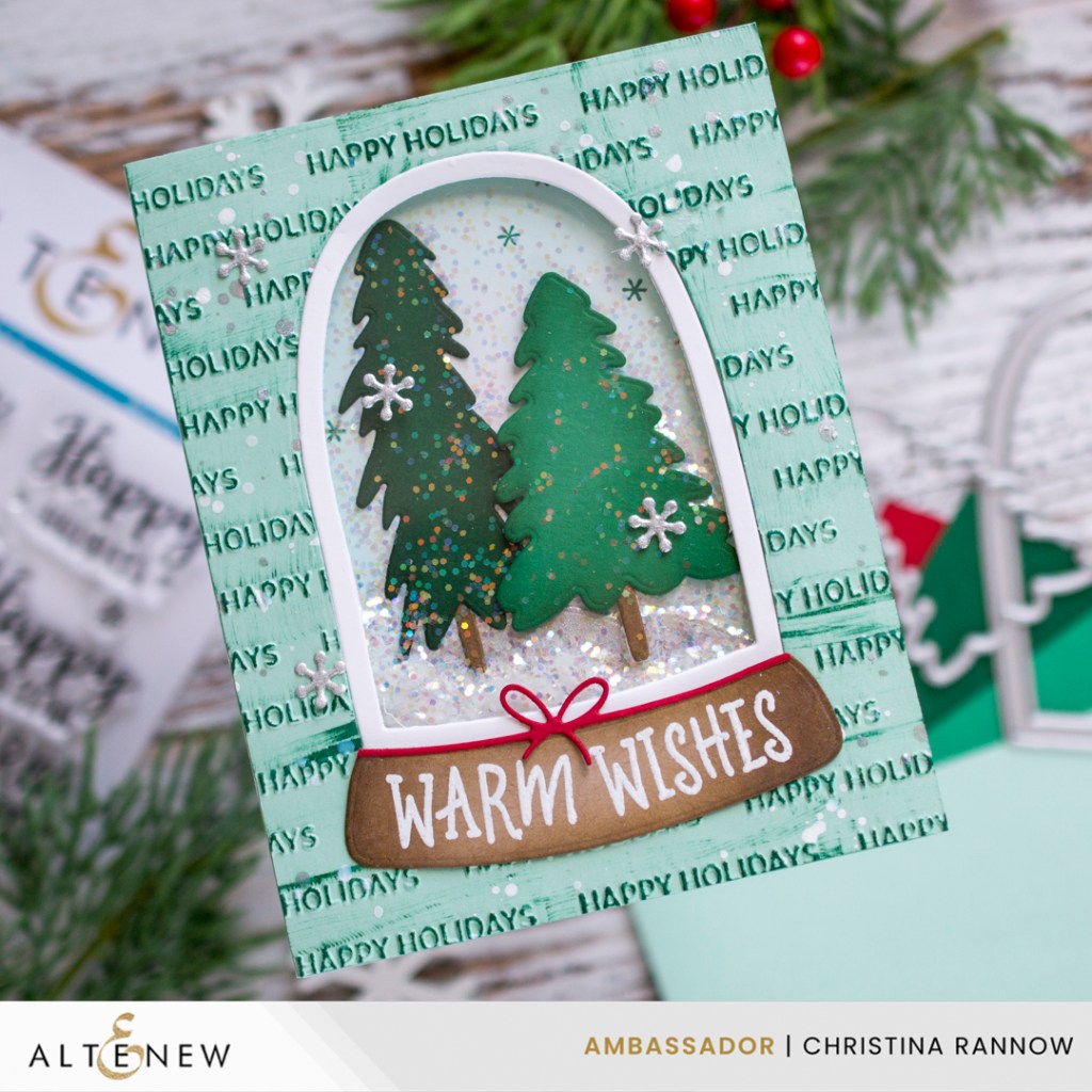 Hello! Today, not only am I sharing this snowy shaker card featuring Altenew products, but I’ll also be sharing a special discount code, at the end of this post, for a $10 discount on orders over $99 at Altenew. Plus, today is day one of their early Black Friday and Cyber Monday Sale! What could be better than crafty sales and discount codes at your favorite shops? And now is the perfect time to pick up some supplies for your holiday crafting, like the Globe Builder I used for this snowy shaker card. I love this set because it gives you so many options when creating your snow globe. There are trees, a snowman, two globe options, and a variety of decorative elements. You could easily make multiple cards, all different, from this one set. I chose to use the trees for my snow globe scene and added a Happy Holidays 3D embossed background panel for a little interest. Let’s take a look at how this card came together after the supply list (with affiliate links).