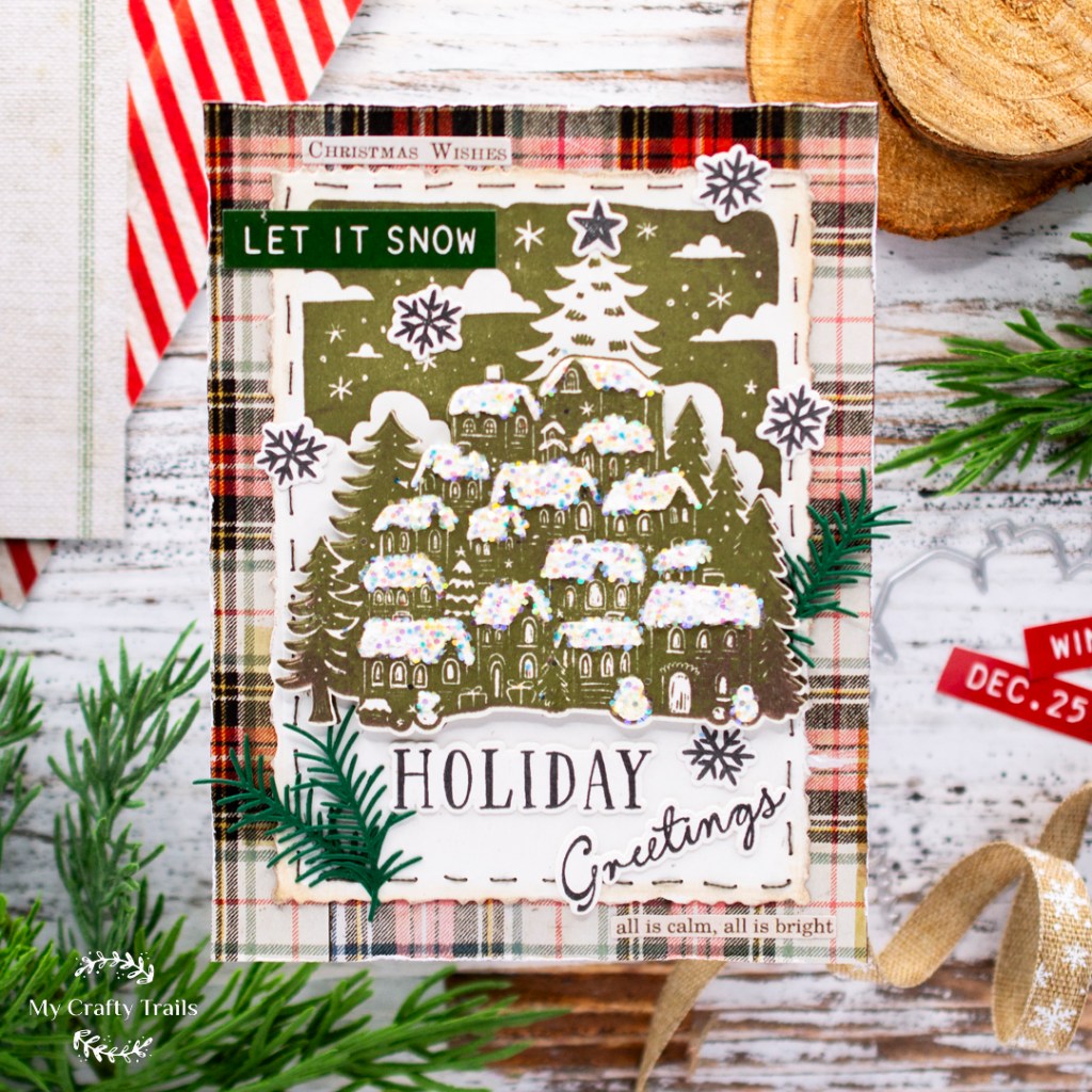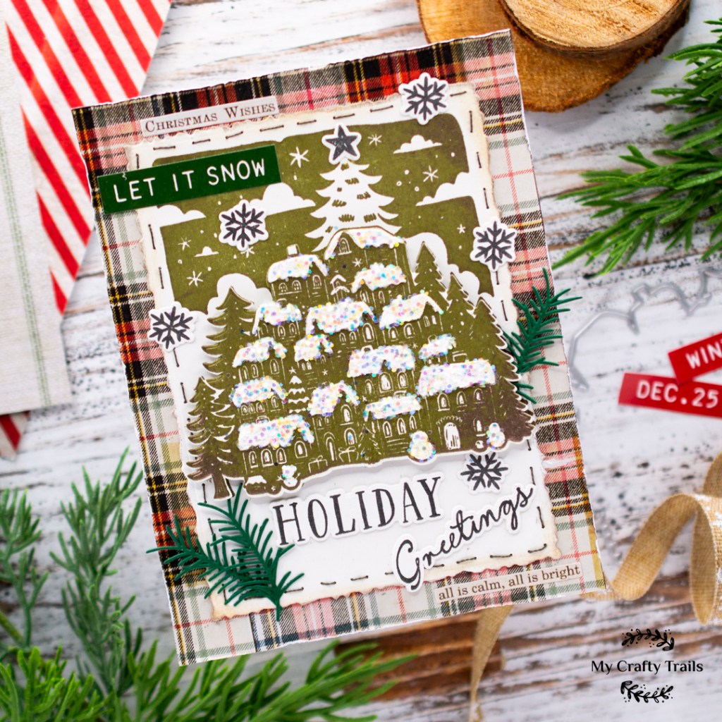 My next step was to layer the deckle-edged panel onto one of the plaid patterned papers that I trimmed to 4.25 x 5.50. Then I added a stamped and die-cut sentiment and a few sentiment strips and phrases from the included sticker book. The finishing touches were to add some holiday greenery, a flurry of stamped and die-cut snowflakes, and a star to adorn the Christmas tree.