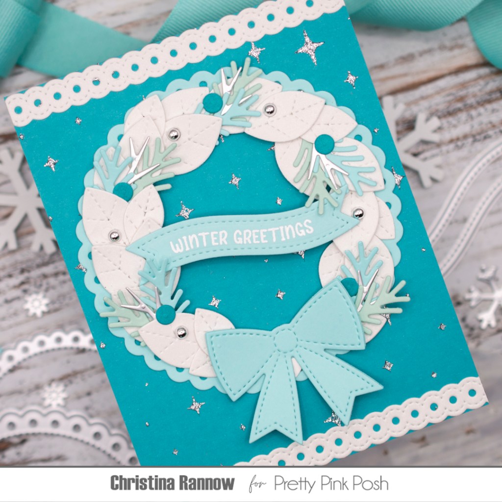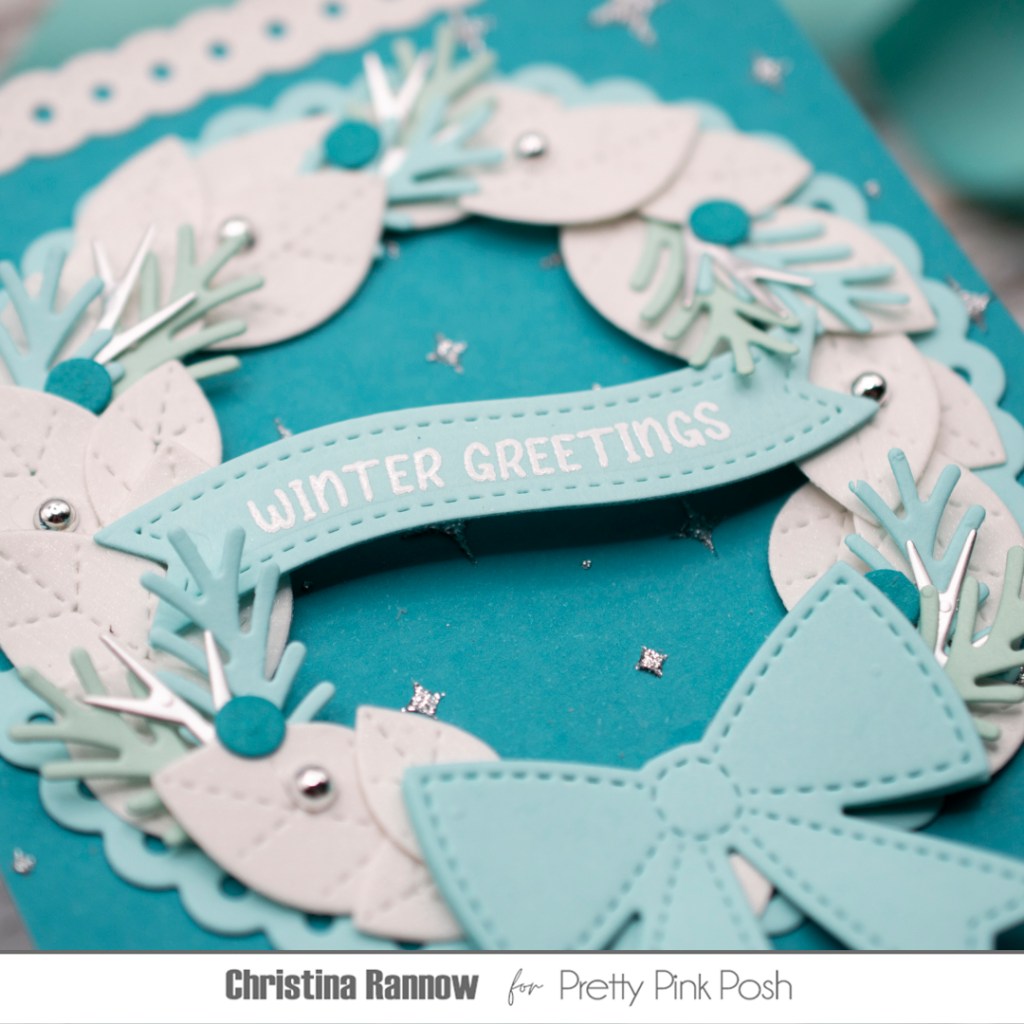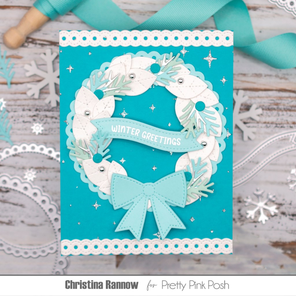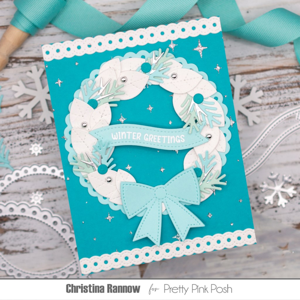 Hi friends! I’m thrilled to announce that I’ll be a part of the Pretty Pink Posh Design Team for another term! Being a part of this team brings me so much joy, and it’s truly an honor to design alongside all of the super talented designers on the team. To share the exciting news and to celebrate the season, I created a sparkling icy winter wreath using a combination of newer and older products, including the Holiday Wreath Builder Die set. This set is so versatile, and I love reimagining it for more than just Christmas. Take a peek at all the supplies I used for this card design, and then we’ll get started!