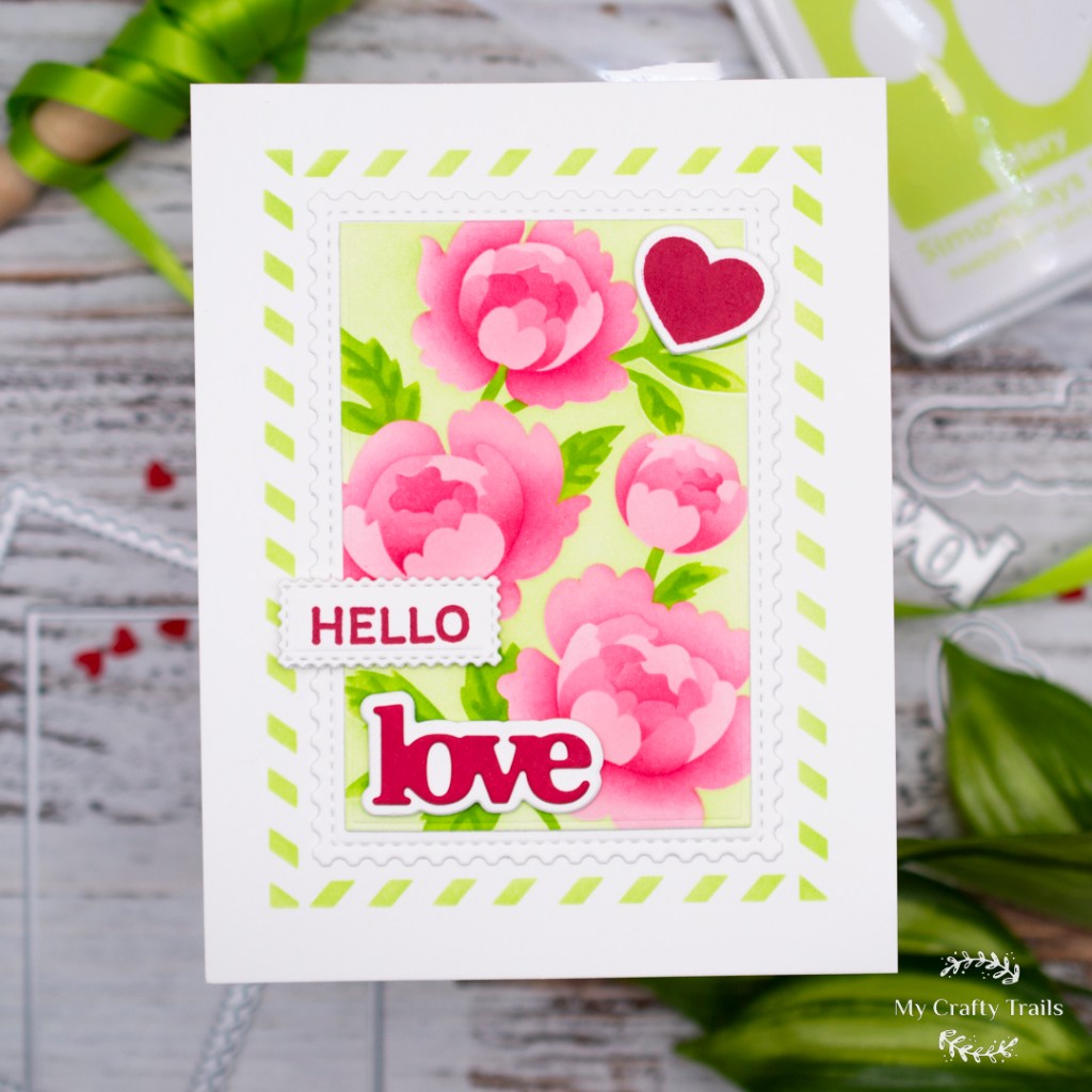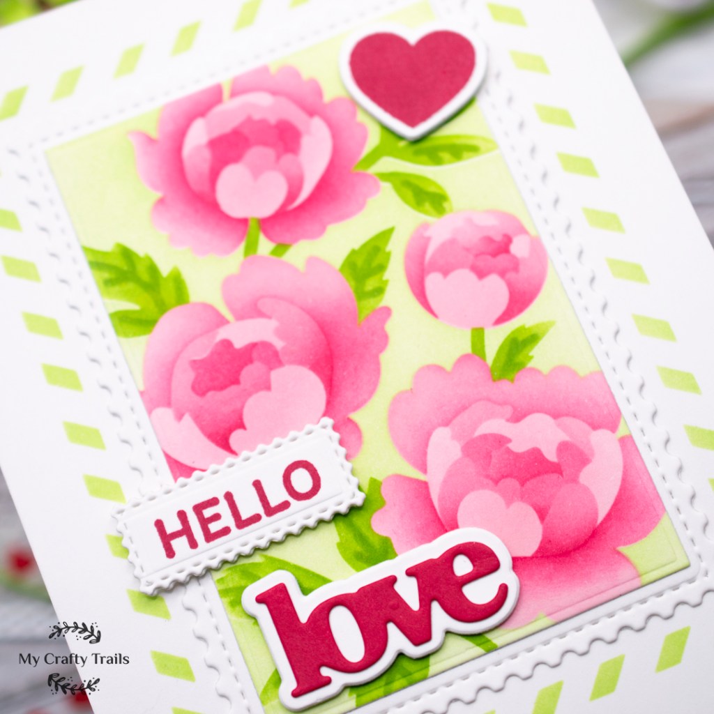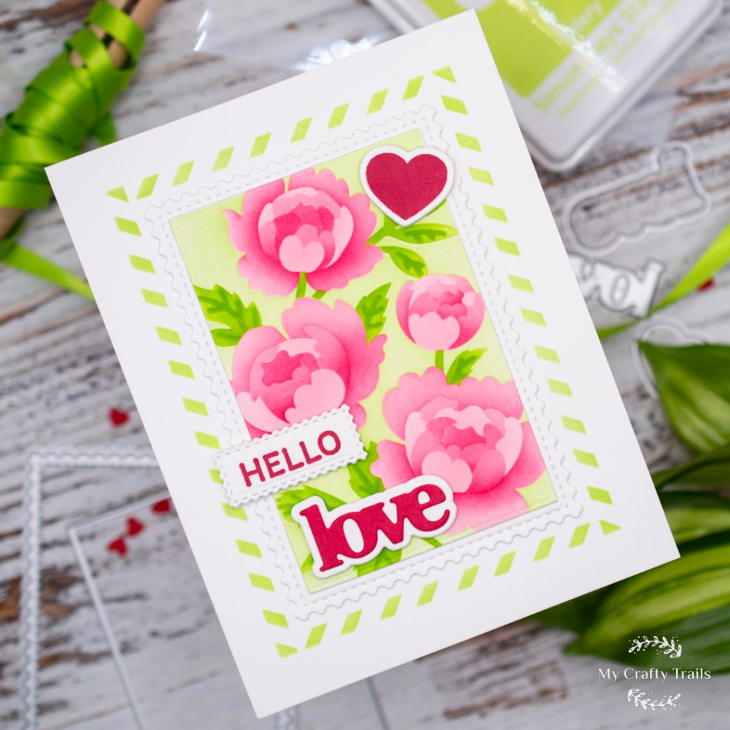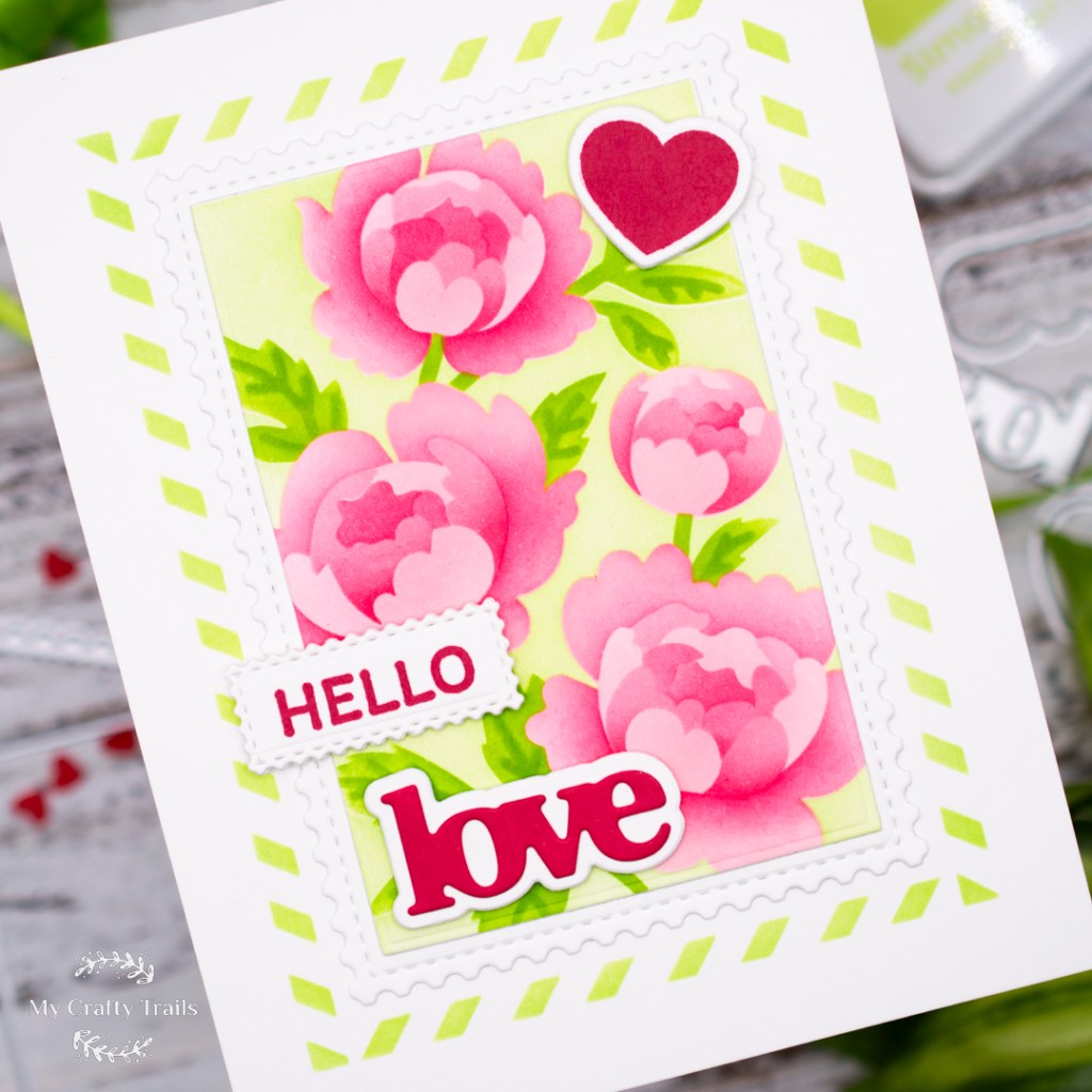 Hi crafty friends! I’ve been working on a lot of Valentine-themed cards, including this one featuring Waffle Flower’s Nesting Postage Collage Peony Stencil. This stencil was part of a recent sneak peek, and I’m obsessed! Peonies are my favorite flower, and this layered stencil is stunning! To round out my design, I combined the stencil with other coordinating nesting postage collage goodies as well as the Print and Script With Love die set. Check out my supply list. and then we’ll get started!