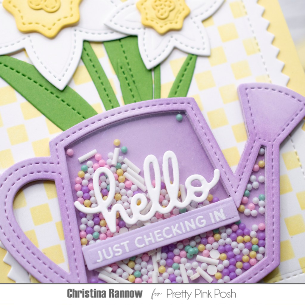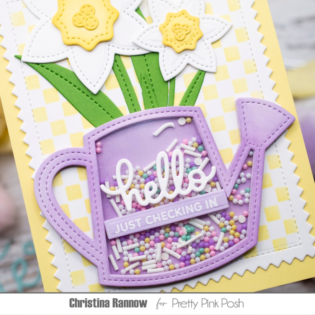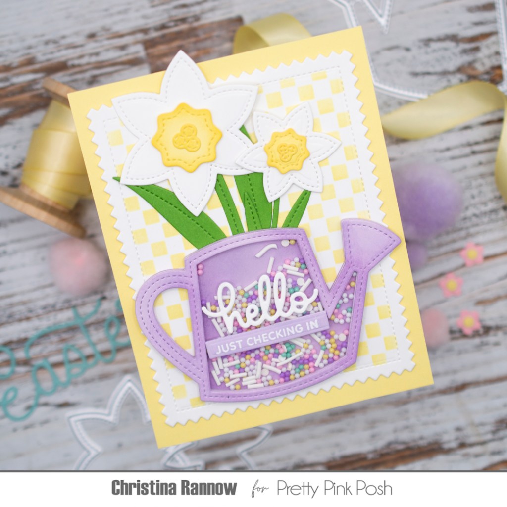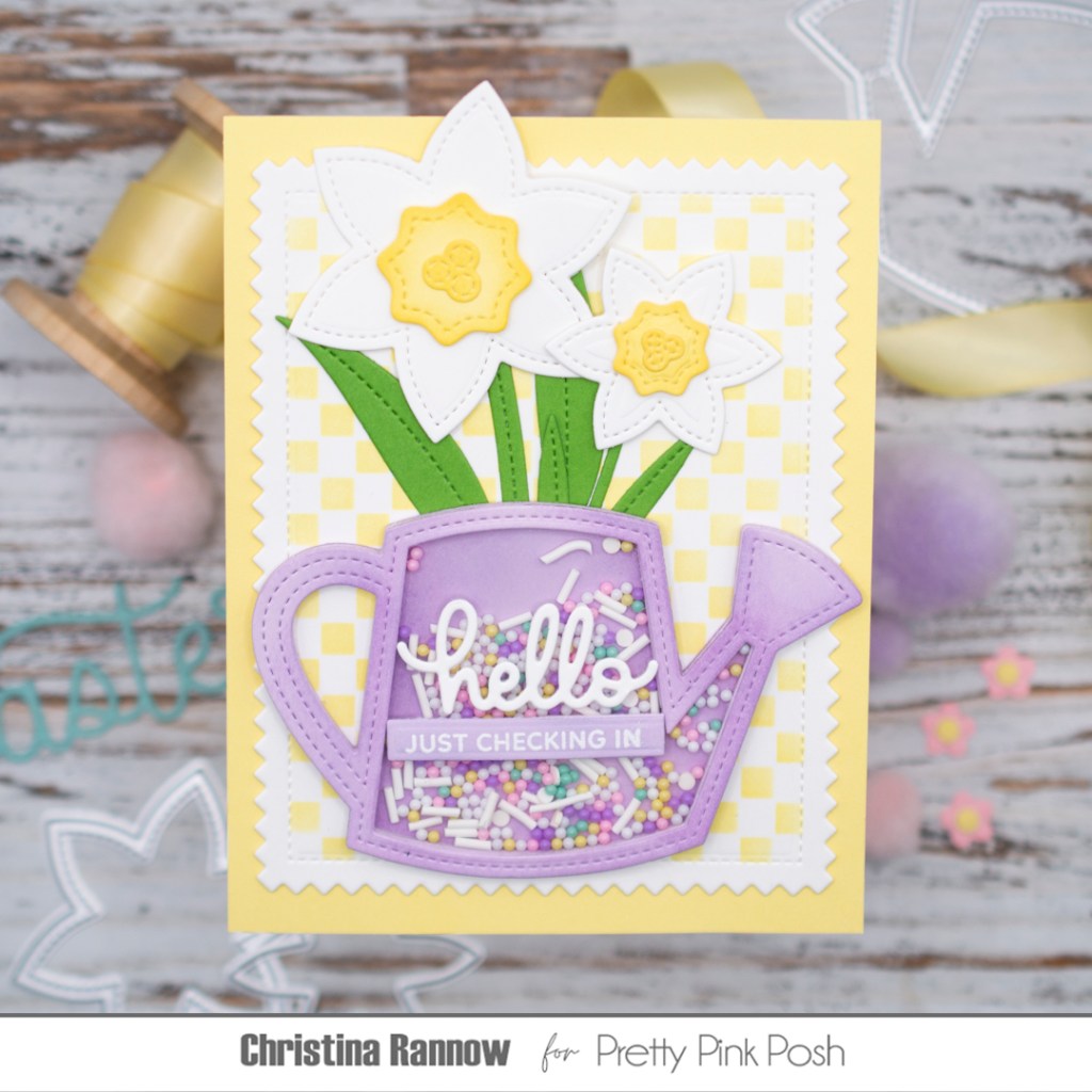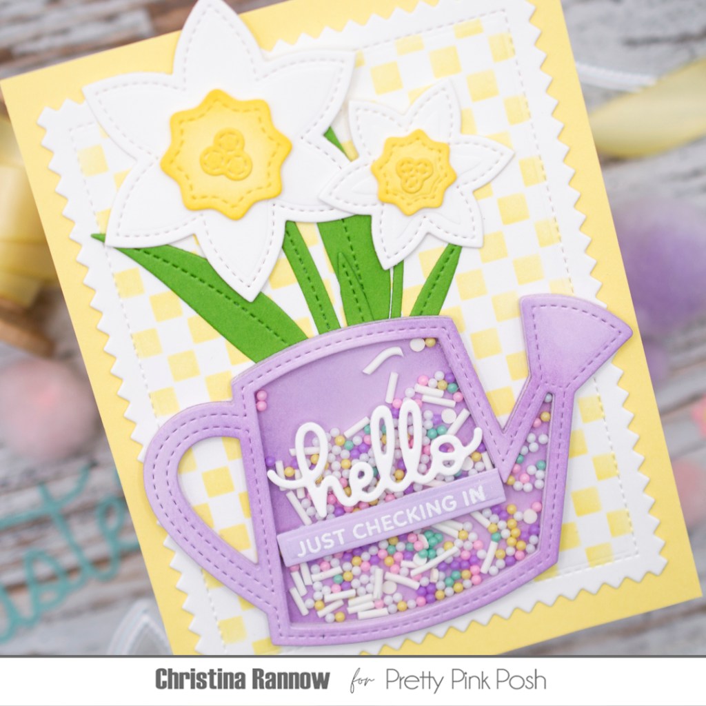 Hi friends! Can you believe the spring release from Pretty Pink Posh is here already?? We could all use some signs of hope and spring renewal right now, so let’s take a look at some of the springtime and Easter-themed goodies in the latest release! Today I’m sharing a beautiful shaker card featuring the new Watering Can and Daffodil Shaker sets. I chose to make just the watering can a shaker and filled it with pretty Pastel Dreams shaker beads. I paired these new die sets with one of my favorite things from the release, the Mini Checker stencil. The small scale of the checker design makes it the perfect subtle backdrop for almost any card design. Check out the supplies I used for this pretty springtime card, and then we’ll get started!