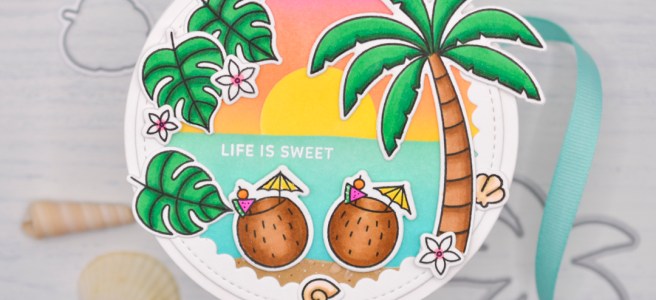 Hi friends! Today I'm sharing a shaped card using a variety of stamp sets from Pretty Pink Posh, including the Summer Drinks stamp set. I chose to use just the coconut drinks from the set and created a beach sunset scene inside a Scallop Circle. I added palm leaves, tropical flowers, and a palm tree … Continue reading Tropical Shaped Card with Pretty Pink Posh